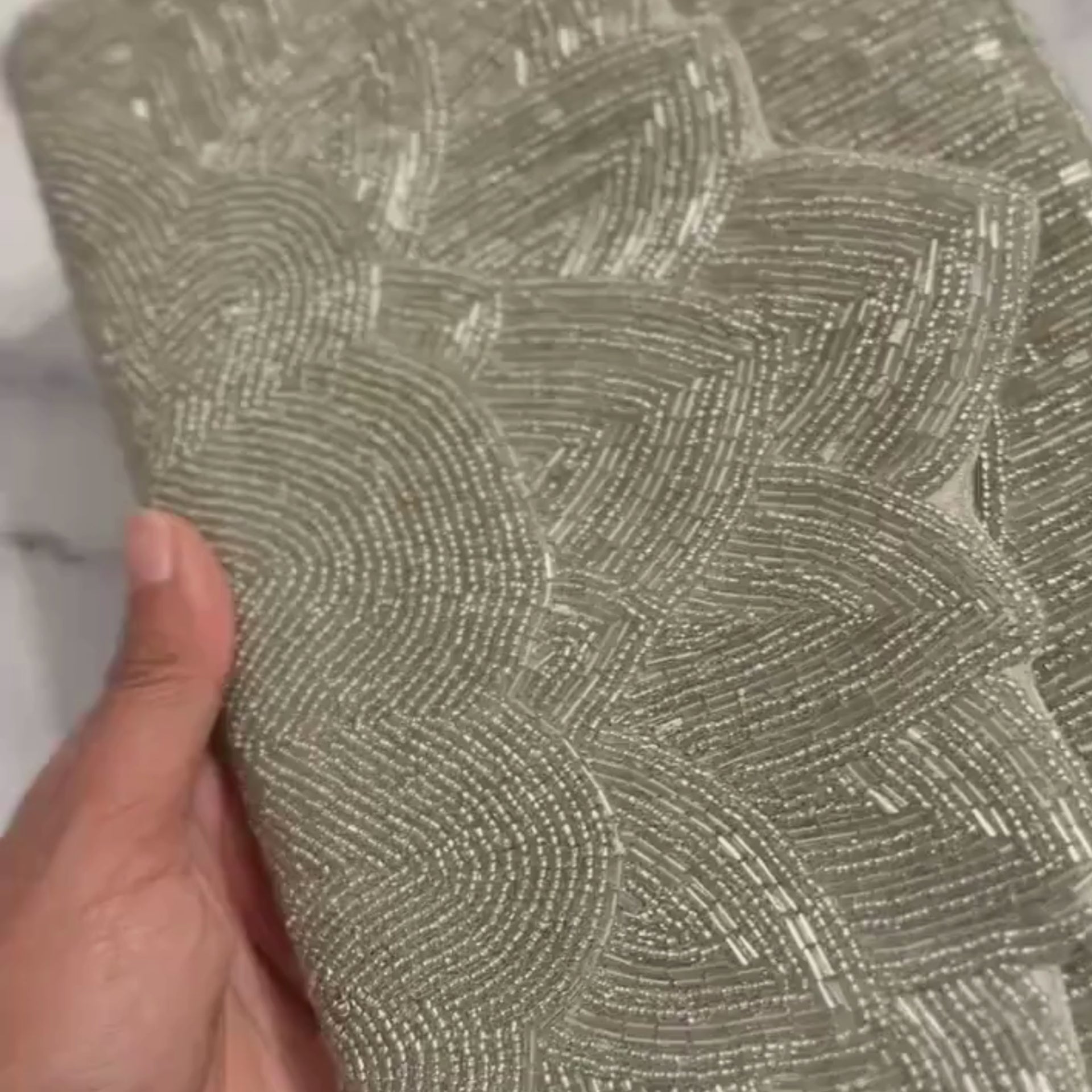 Silver Scalloped Beaded Crossbody Clutch Handbag• Bag Size : 6" X 8.5"• Chain Strap Size: 48" L, Detachable• One Inside Slip Pocket• Magnetic Closure• Beads on Front Only