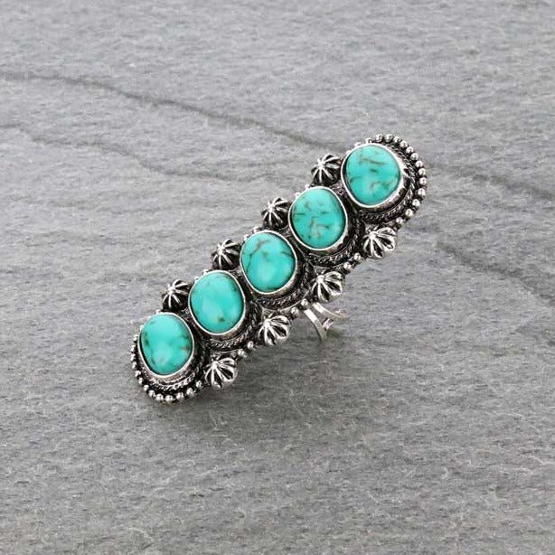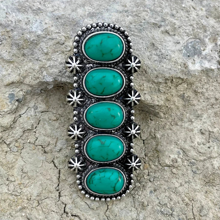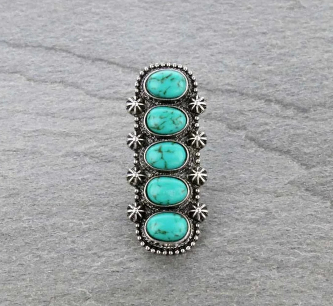 Stack up the western charm with the 5-in-a-Row Turquoise Ring. This sleek silver ring features five radiant turquoise (Turquenite) stones arranged in a perfect line, symbolizing balance and strength. The electro-plated metal design delivers a long-lasting shine while remaining hypoallergenic and safe for sensitive skin. Finished with a cuff-style back, it’s a bold yet refined piece made for modern cowgirls and boho dreamers alike.