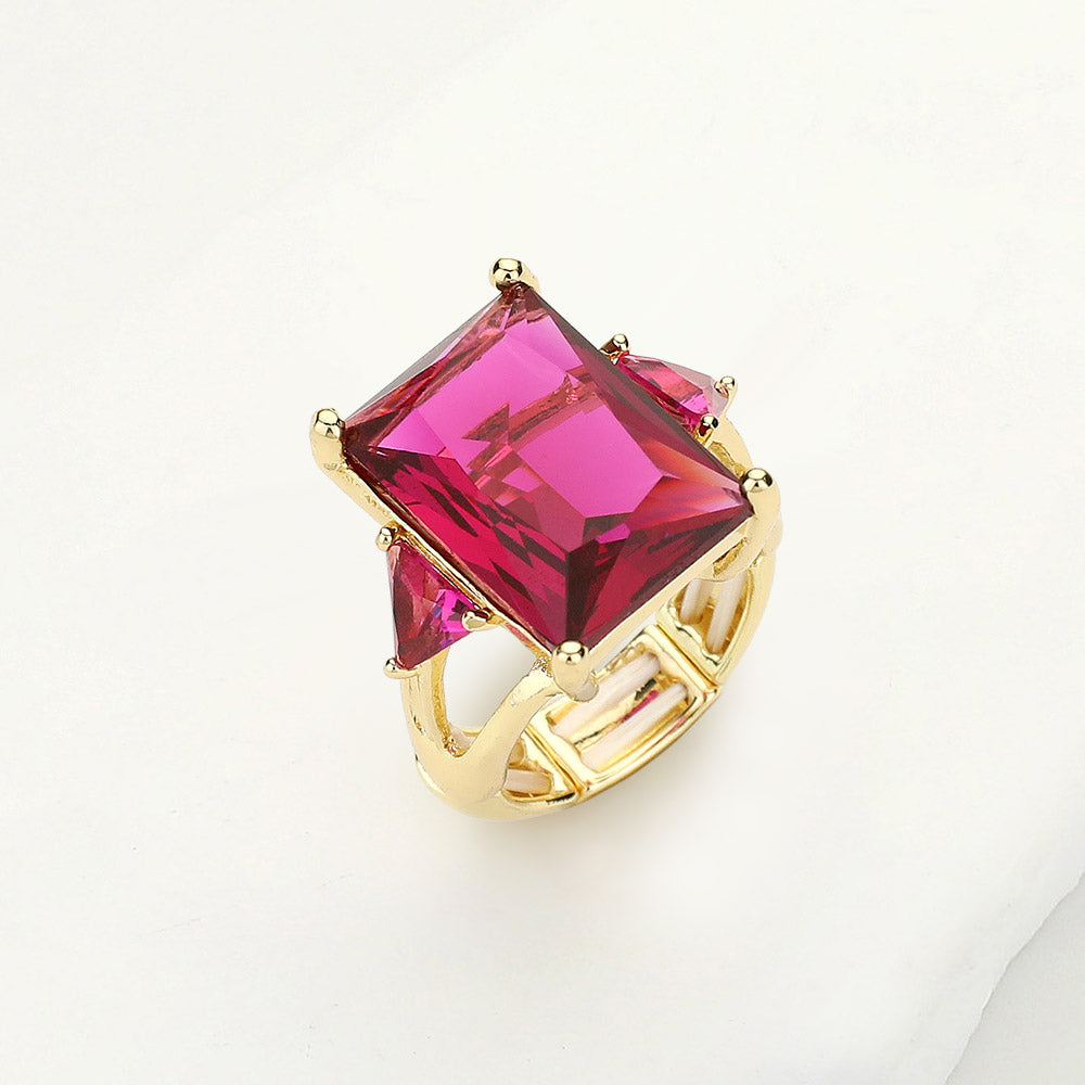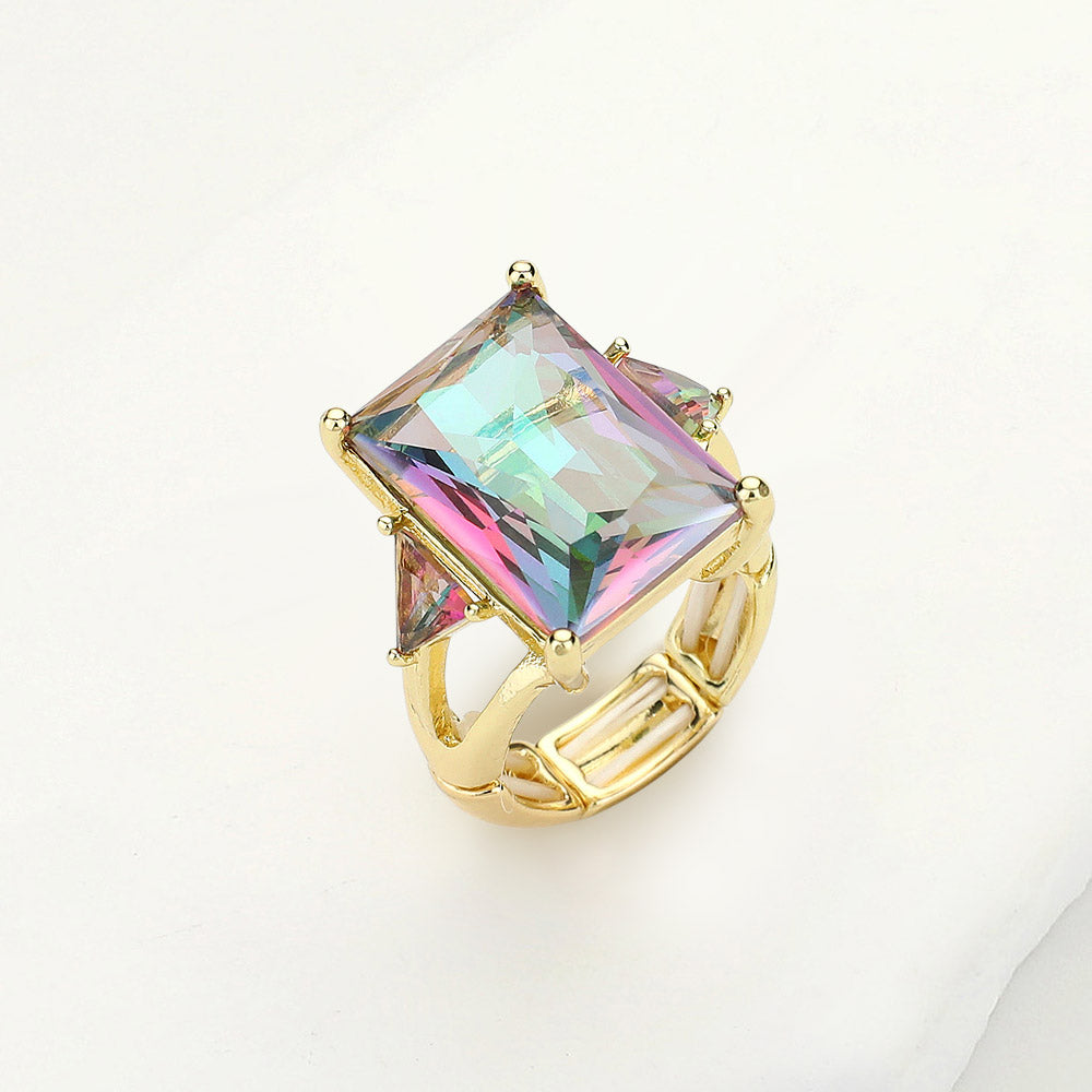 Make a bold entrance with the Ariana Faceted Cut Crystal Statement Ring. A radiant rectangle-cut centerpiece is flanked by two sleek geometric side stones, all set in luminous electro-plated gold. With its comfortable stretch-to-fit band and three stunning color options, Ariana delivers instant glamour from everyday outfits to evening looks.