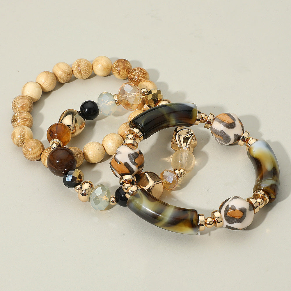 Eye-catching multi-layer stretch bracelet set of 3 individual bracelets featuring a unique blend of smooth, faceted, and patterned beads. Perfect for adding texture and a bold statement to casual or dressy outfits with versatile, all-season appeal.