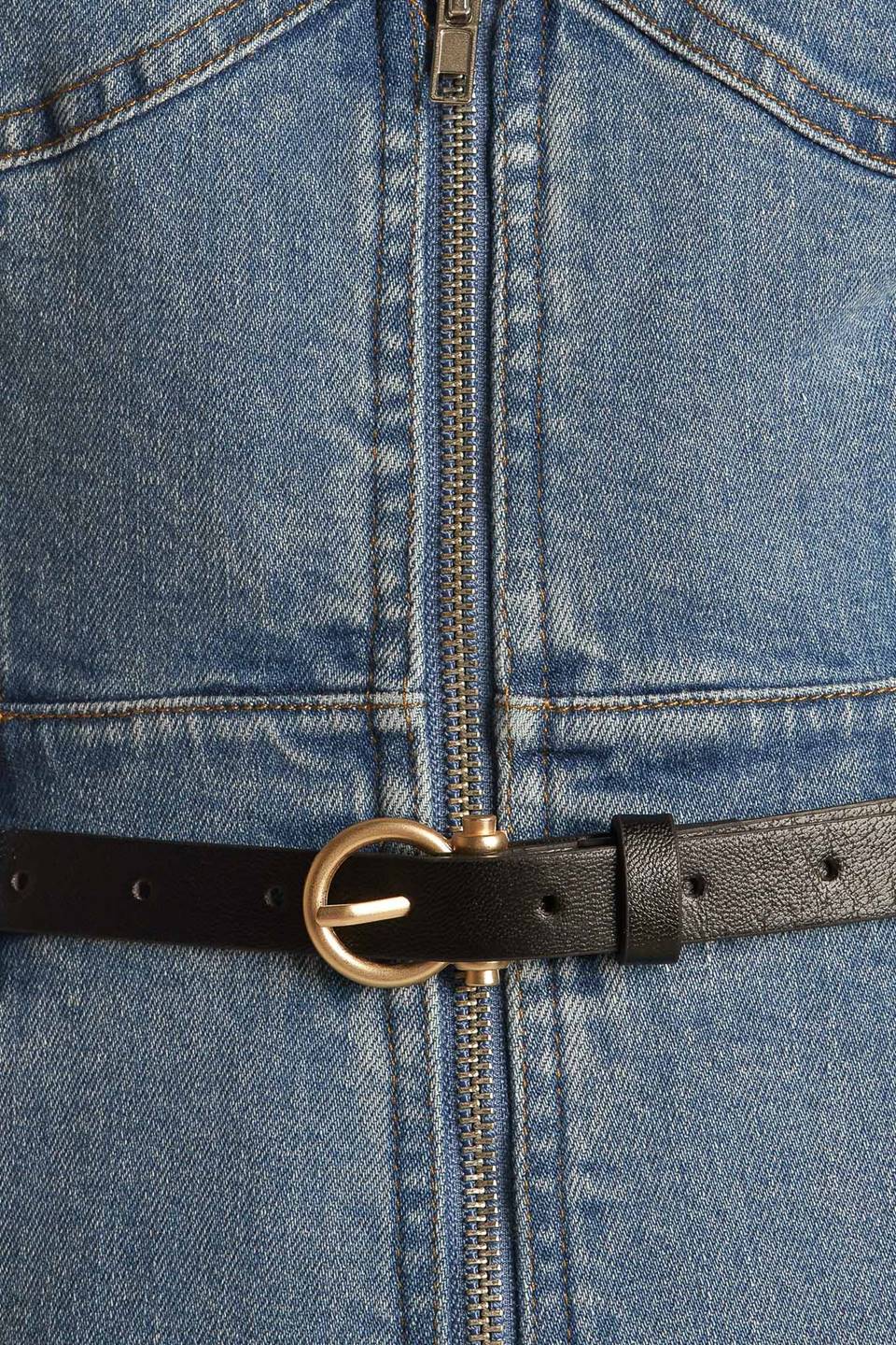 A washed denim jumpsuit featuring deep V neckline, sleeveless, front zipper closure, side pockets and wide leg.