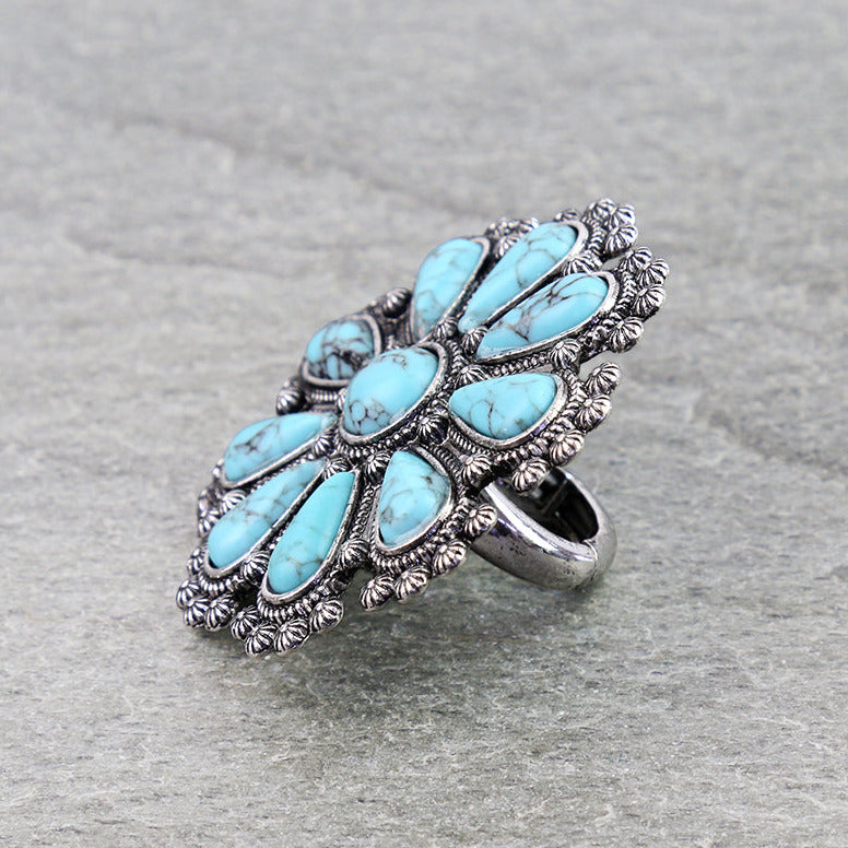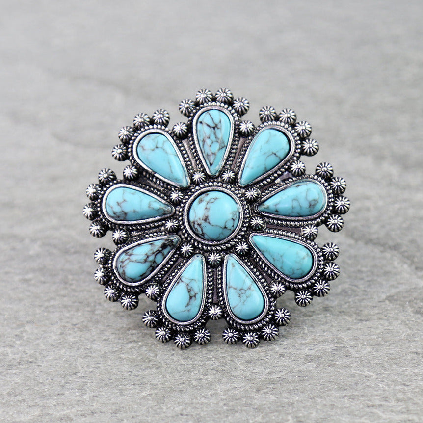 #westernjewelry #turquoisering #floralring #statementring #stretchring #bohowestern #fashionjewelry #cowgirljewelry #electroplatedmetal #womensjewelry #giftforher #madeinusa #rhodeislandmade #turquoisestyle #boldaccessories #westernstyle #countrycharm #everydayglam #desertbloom