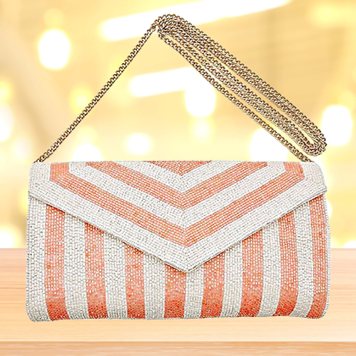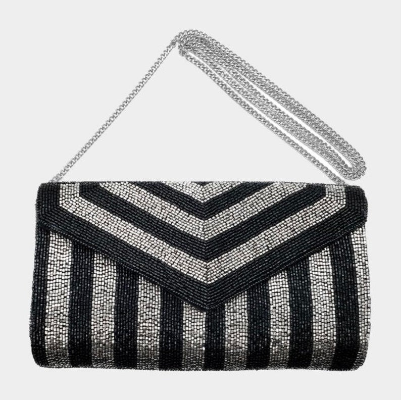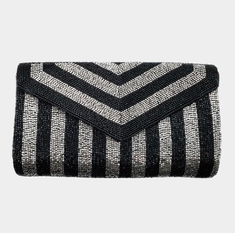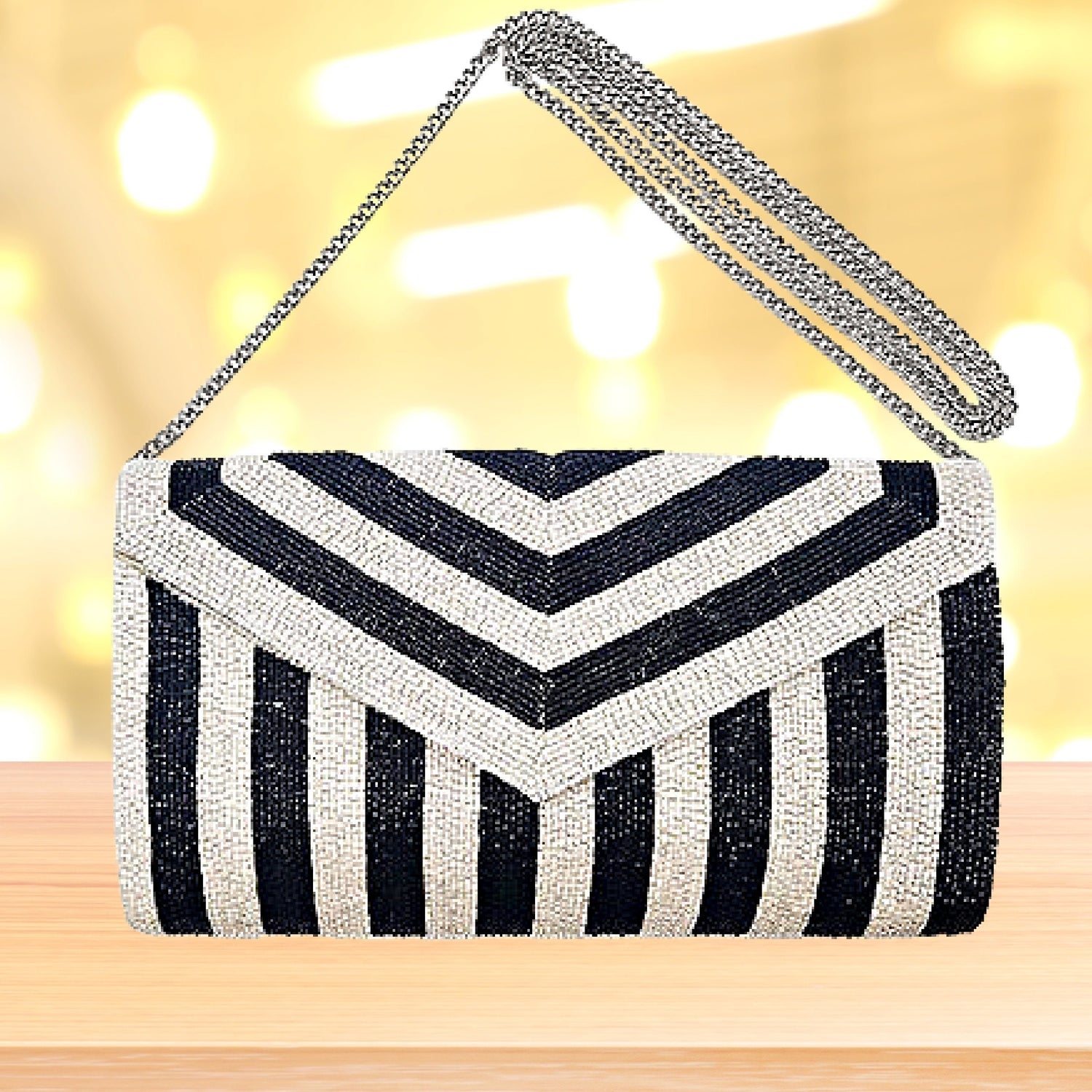 Black Pink Striped Beaded Crossbody Clutch Handbag