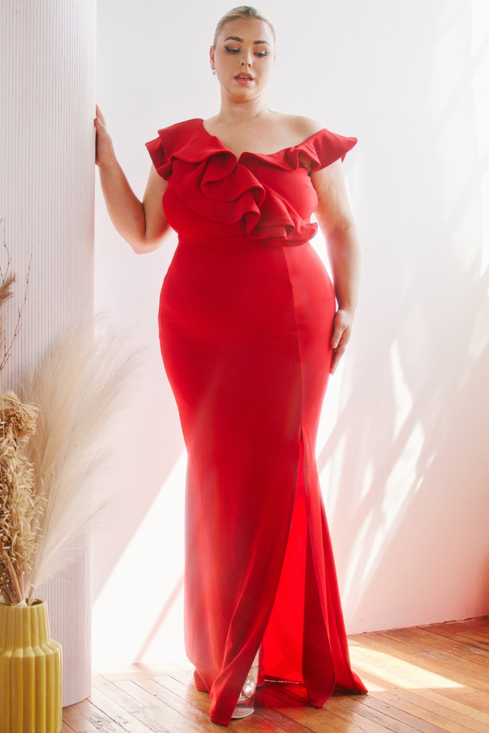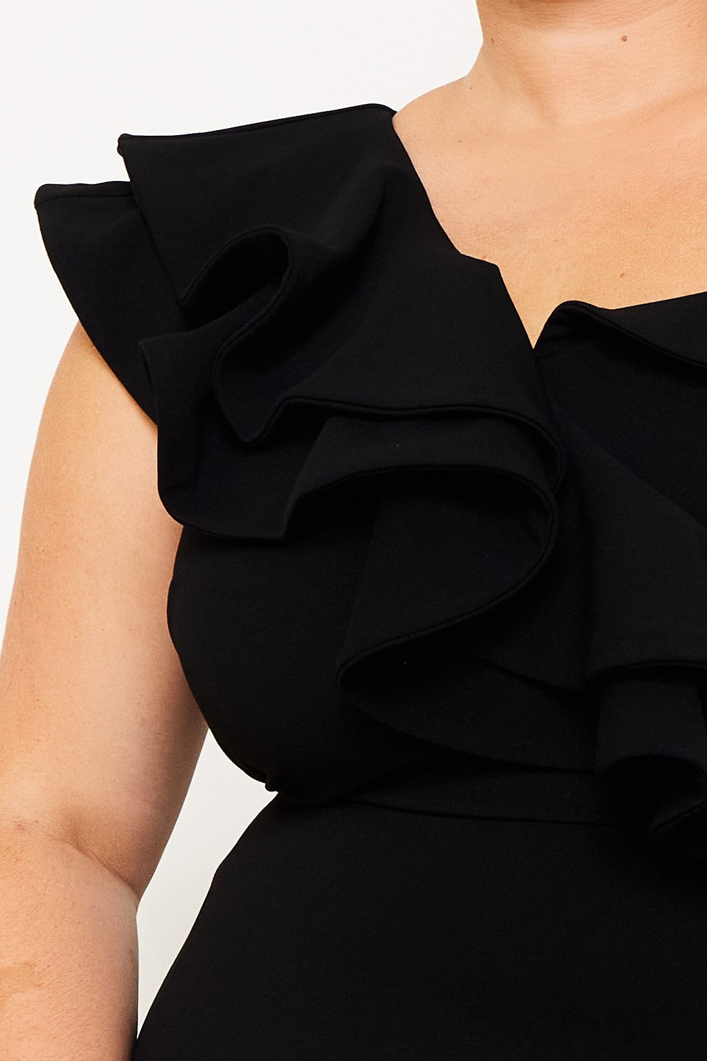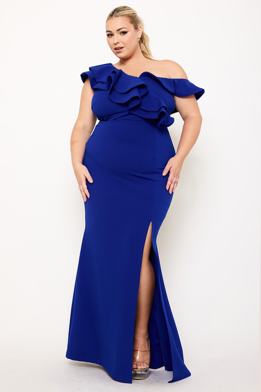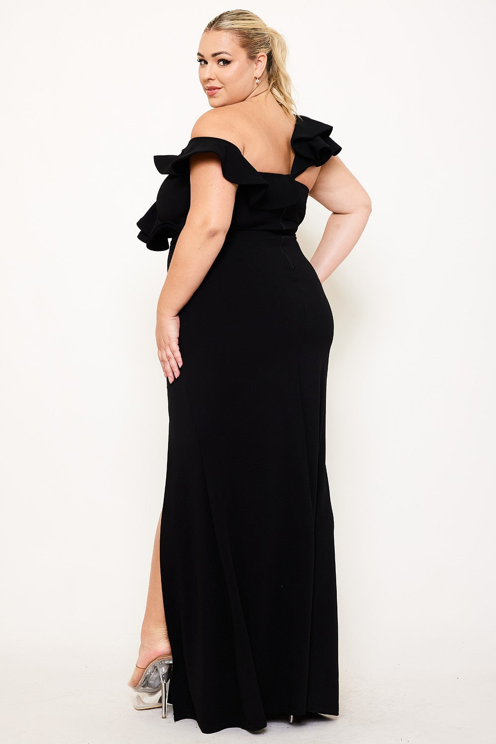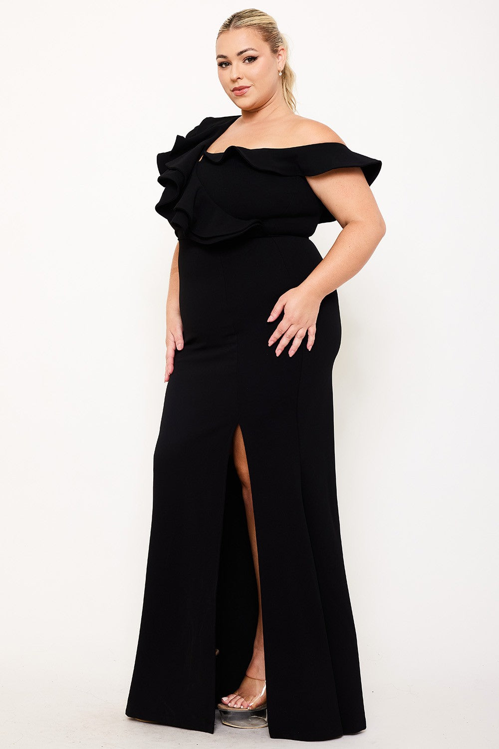 Classic meets modern glamour in the Black-Tie Beauty One-Shoulder Ruffle Gown, a plus-size maxi crafted for timeless elegance. Featuring a dramatic double ruffle one-shoulder neckline, a graceful floor-length silhouette, and a slit on the left leg, this gown is as sophisticated as it is flattering. Moderate stretch and a secure zipper back ensure comfort for evening-long wear.