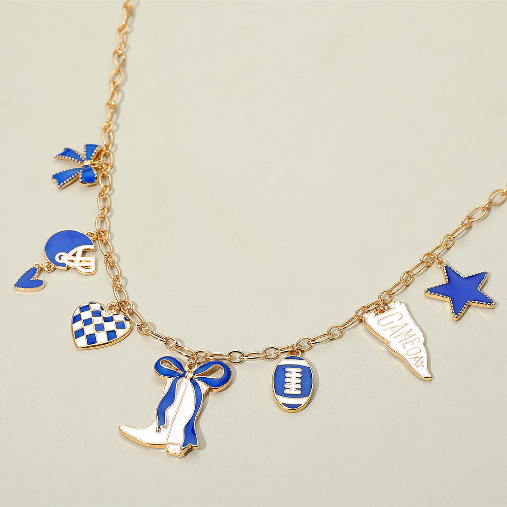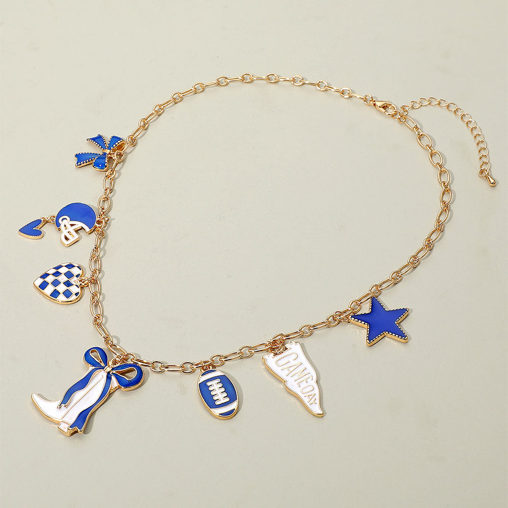 Celebrate your team pride with this Western-themed football charm necklace featuring playful enamel charms — including a football, cheer bow, helmet, heart, star, and boot. A spirited accessory to complete your outfit for sporting events, tailgates, and fan gatherings.