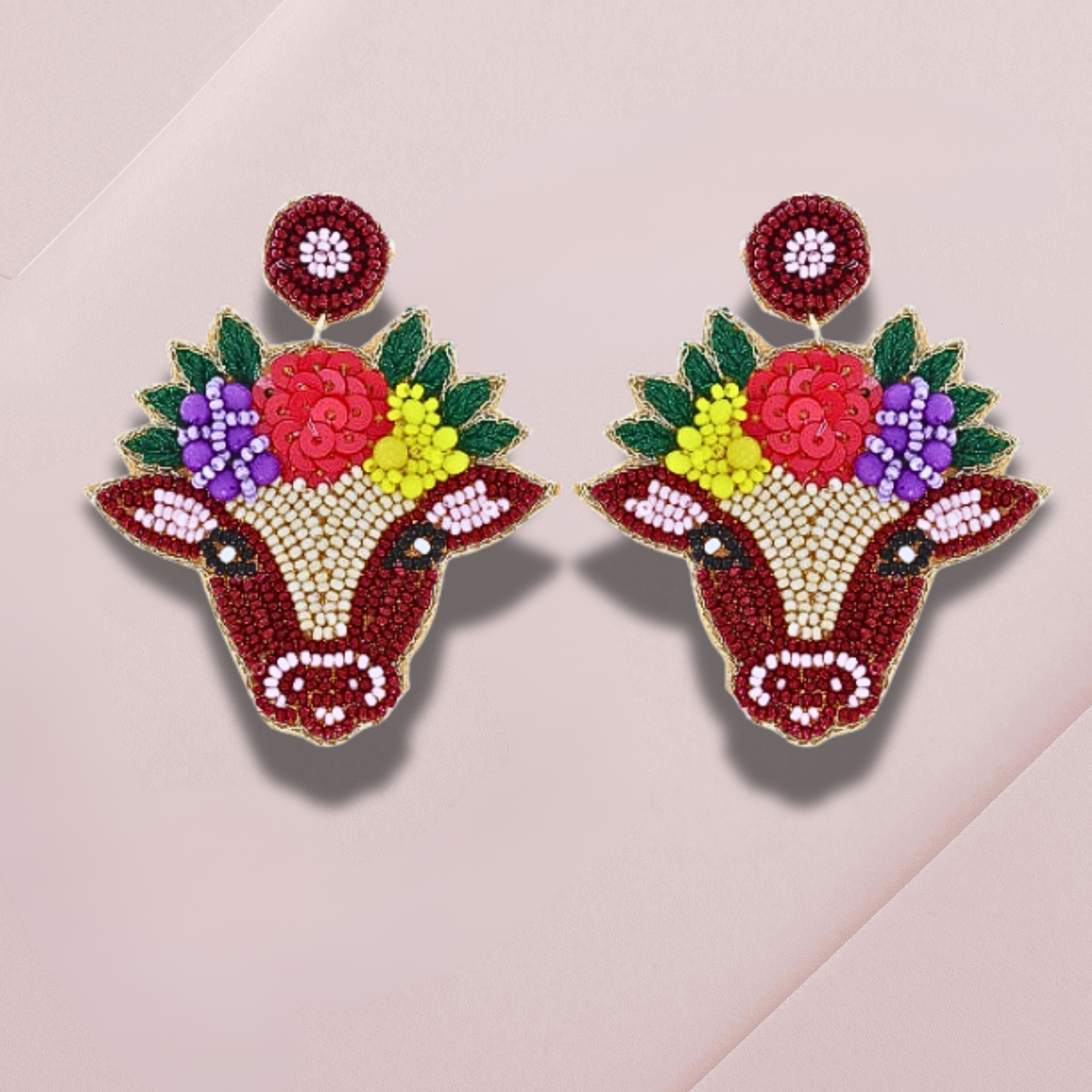 Add western beauty with a bohemian twist in the Boho Flower Crown Cow Beaded Earrings. These handcrafted dangle earrings feature intricate cow skull designs adorned with colorful floral crowns, symbolizing strength and free-spirited style. Lightweight, felt-backed, and hypoallergenic, they blend artisan detail with a feminine western edge—perfect for festivals, markets, or everyday boho looks.