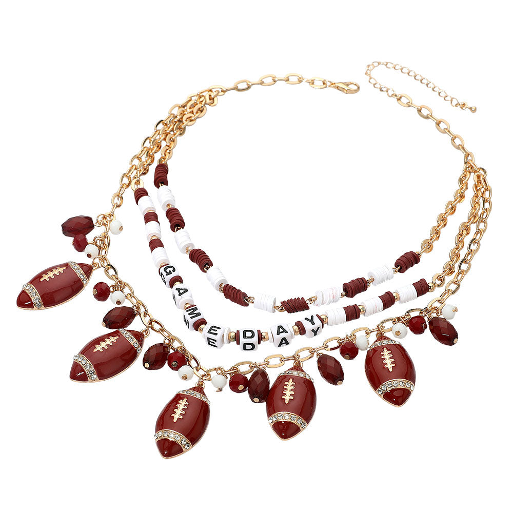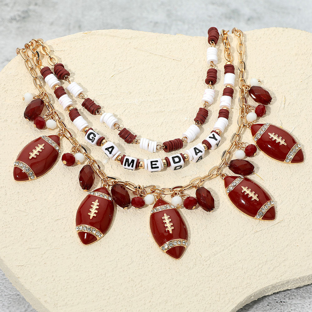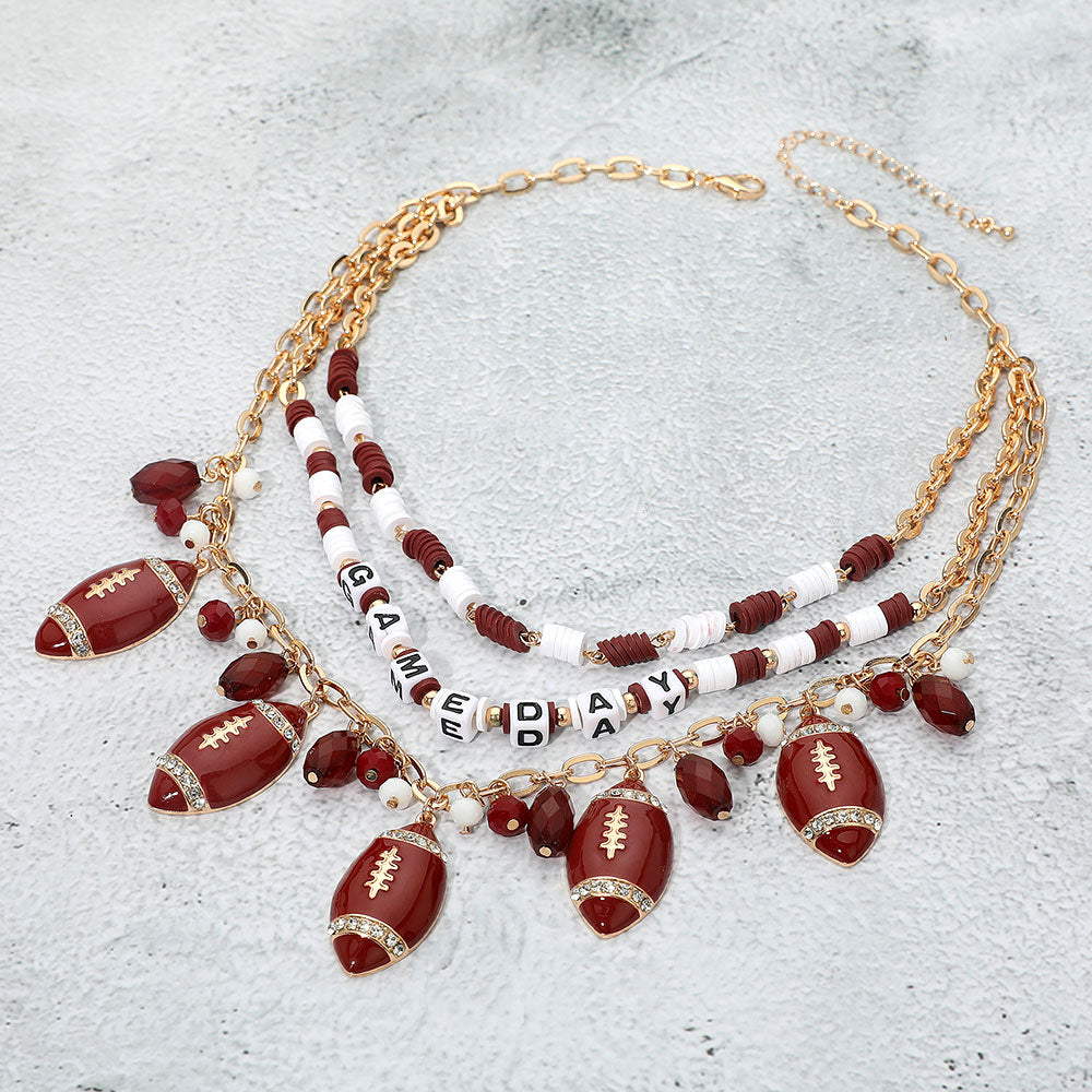 This layered gameday necklace blends burgundy and white Heishi beads with football charms and “GAMEDAY” letter beads to energize any fan look. The playful, layered silhouette pairs perfectly with tees, jerseys, and tailgate-ready outfits.