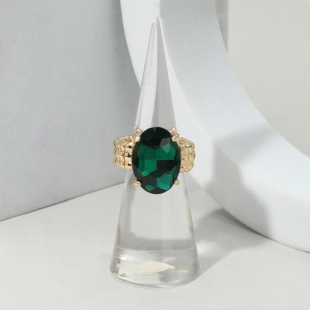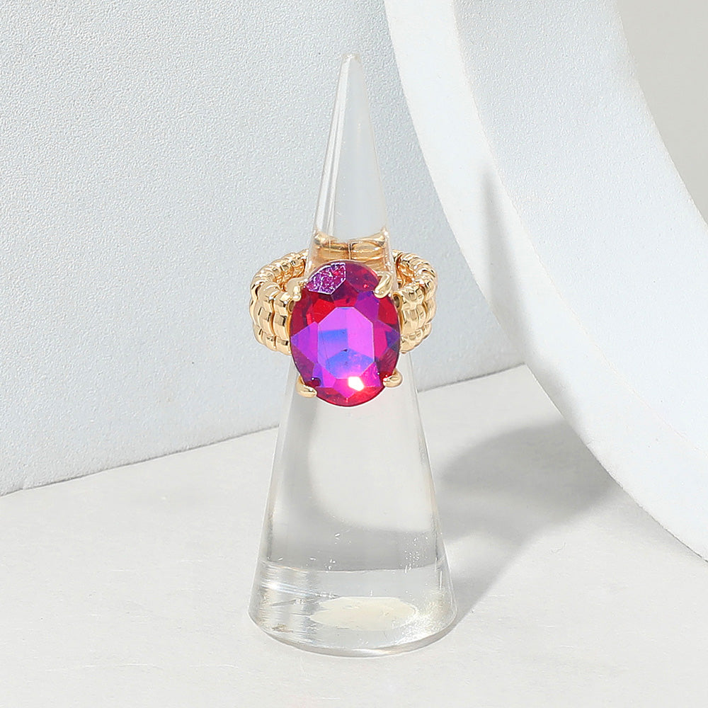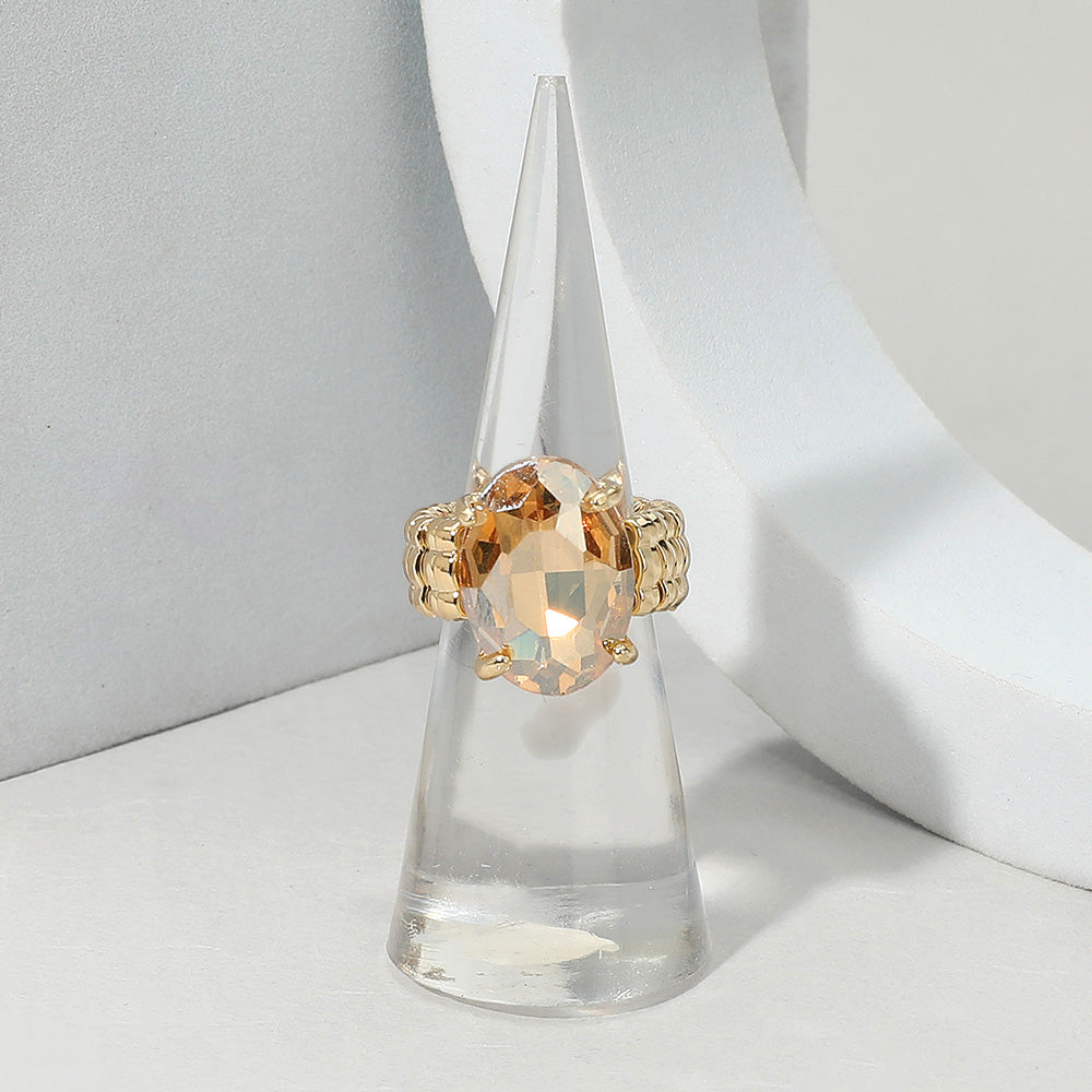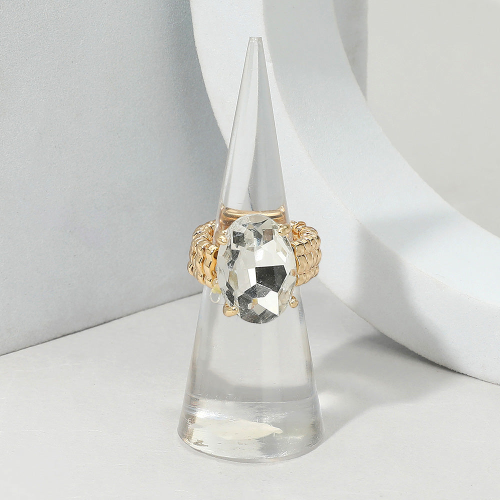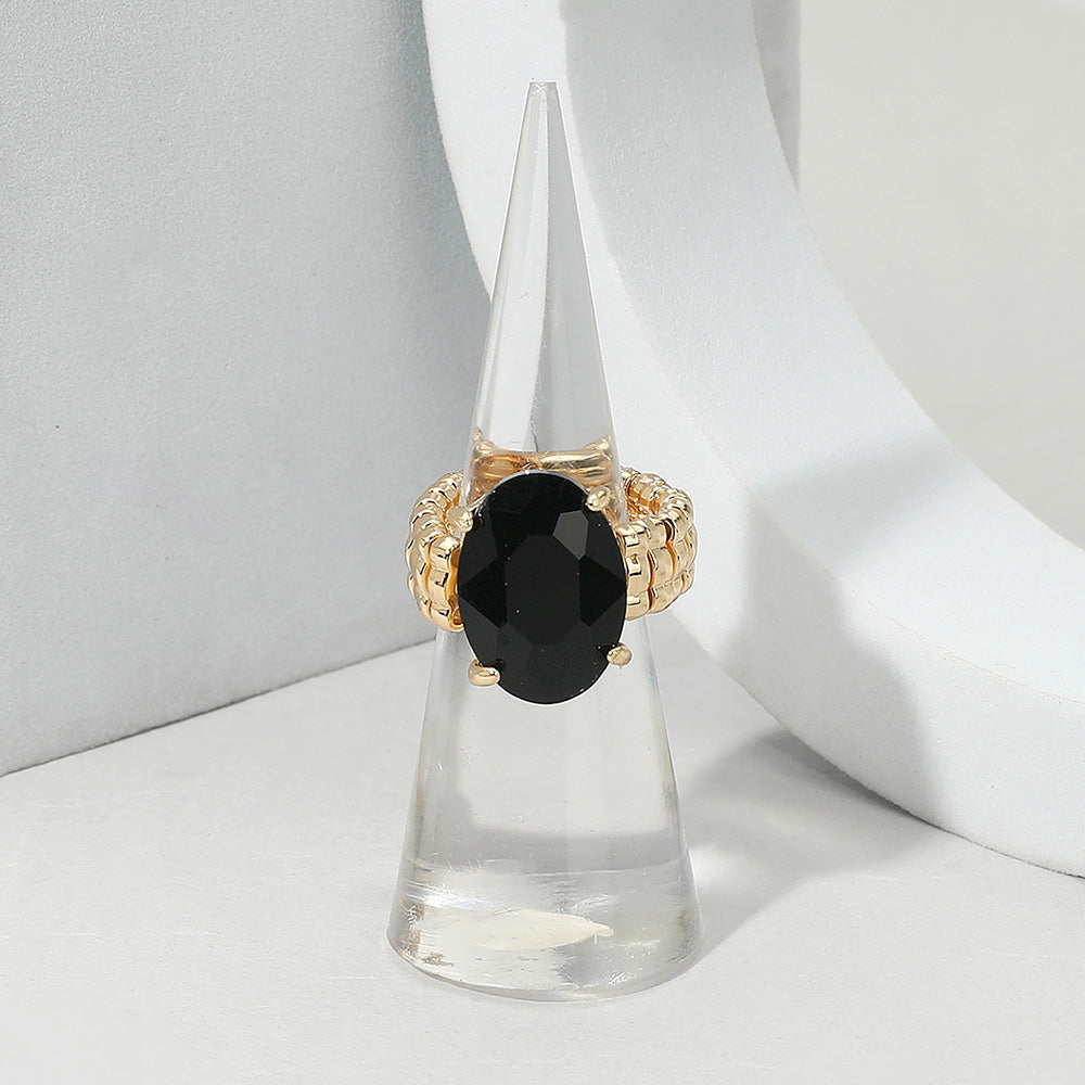 Elevate your style with this striking oval-cut statement ring featuring a faceted center glass-cut stone and a luxe, textured band. The stretchable comfort fit makes it effortless to wear, delivering timeless elegance with a bold, modern edge—from off-duty denim to evening looks.