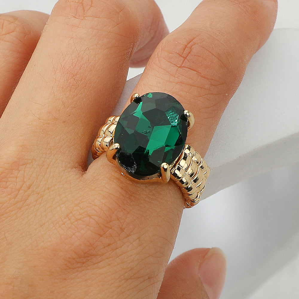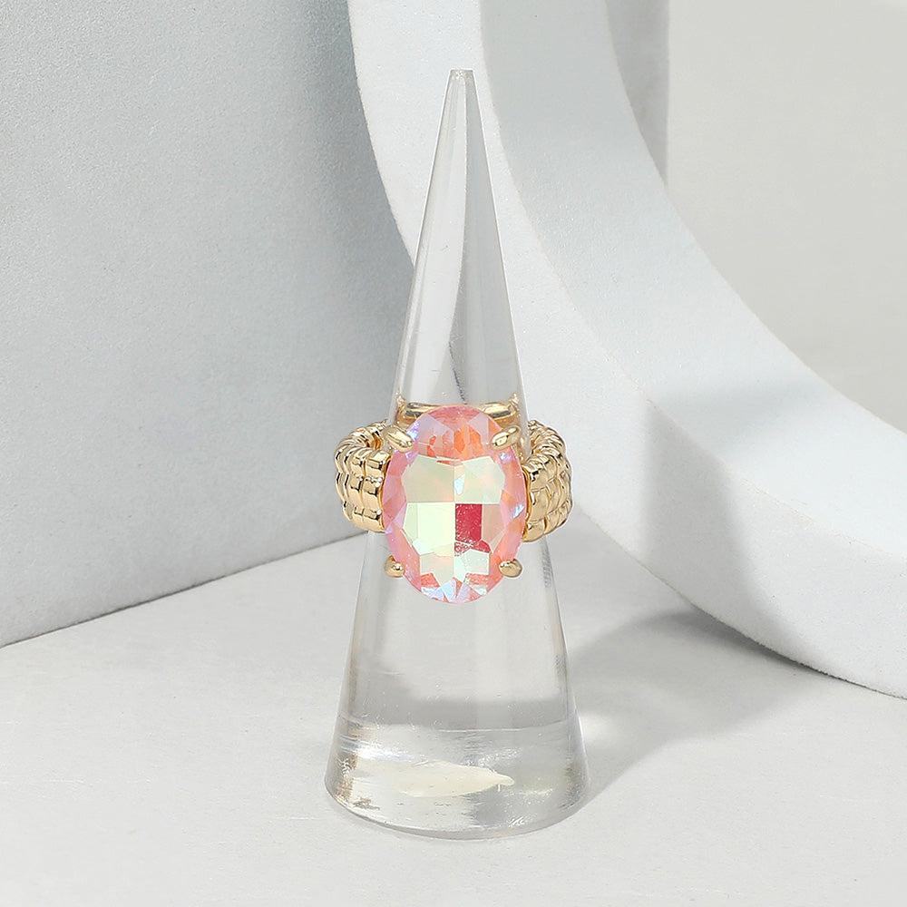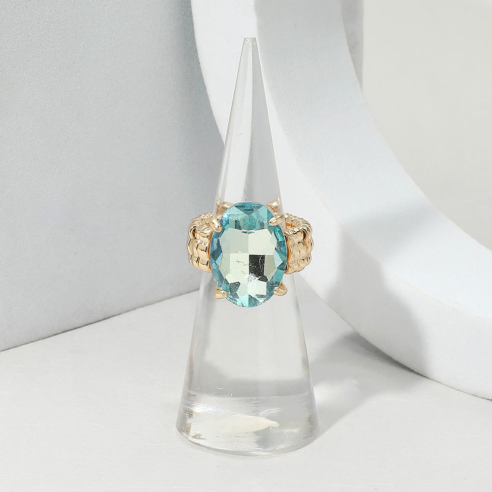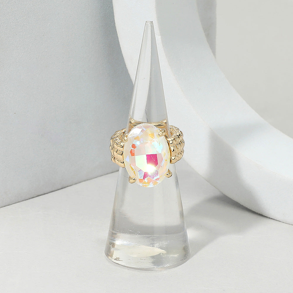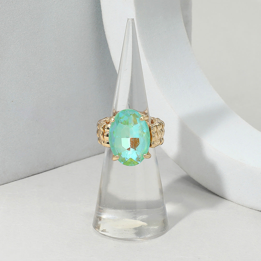 Elevate your style with this striking oval-cut statement ring featuring a faceted center glass-cut stone and a luxe, textured band. The stretchable comfort fit makes it effortless to wear, delivering timeless elegance with a bold, modern edge—from off-duty denim to evening looks.
