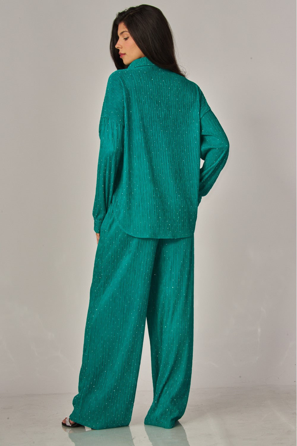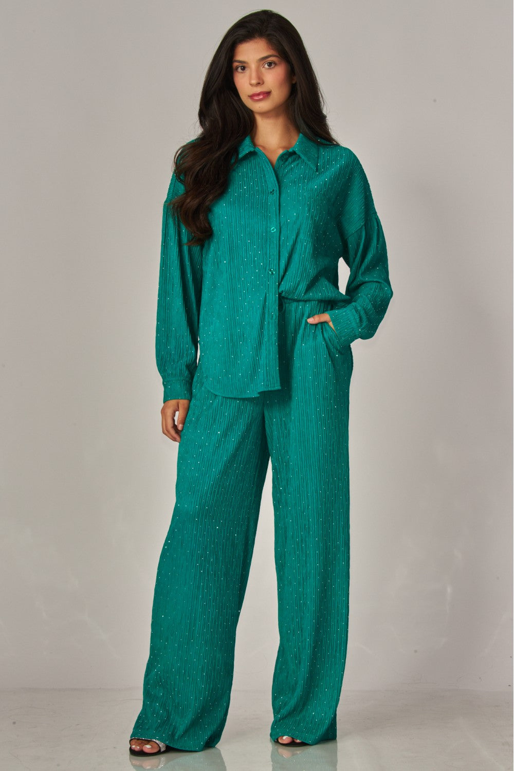 A shimmering vision in plissé, the Catch The Light Rhinestone Lounge Pants Set brings effortless glamour to your day. The button-down blouse drapes with soft, graceful ease, while rhinestone accents add a gentle sparkle that comes alive under any light. Paired with matching wide-leg pants, this set blends comfort, movement, and understated shine — the kind of look that turns a simple outing into a moment.