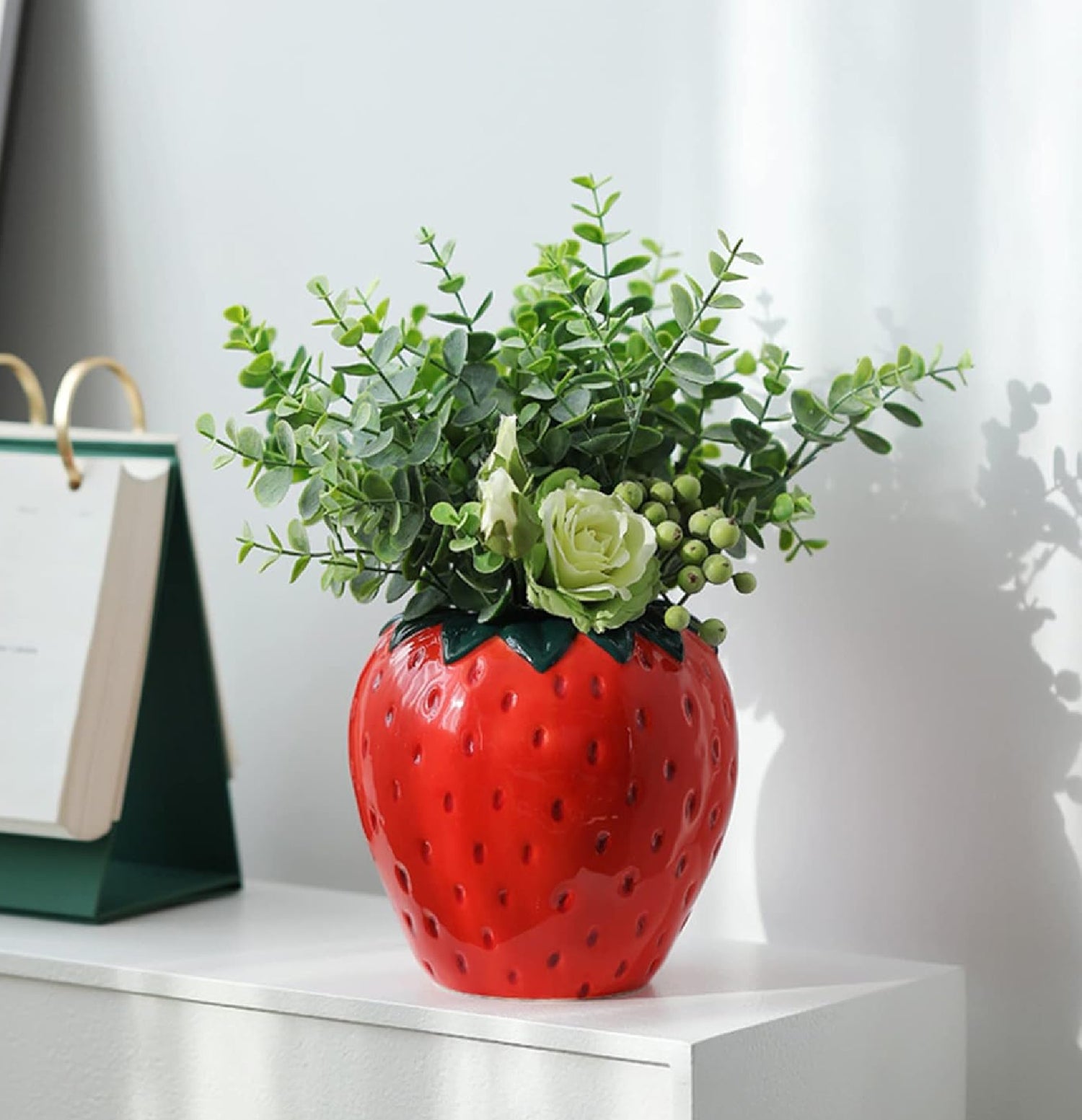 This coated ceramic vase is strawberry-shaped and measures 6 inches (15.2 cm) tall with a base width of 3.25 inches (8.25 cm) so there’s plenty of room for water, flowers, office supplies, paint brushes, or anything else you want to display in a fun, fruity way.