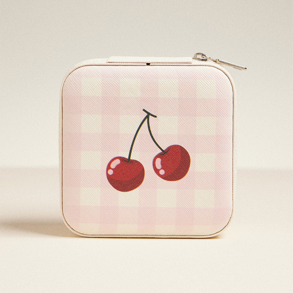 The exterior features a delightful pink gingham check pattern that exudes a vintage and cheerful vibe. Scattered across the gingham backdrop are vibrant red cherry prints, complete with green stems, adding a sweet and whimsical touch.