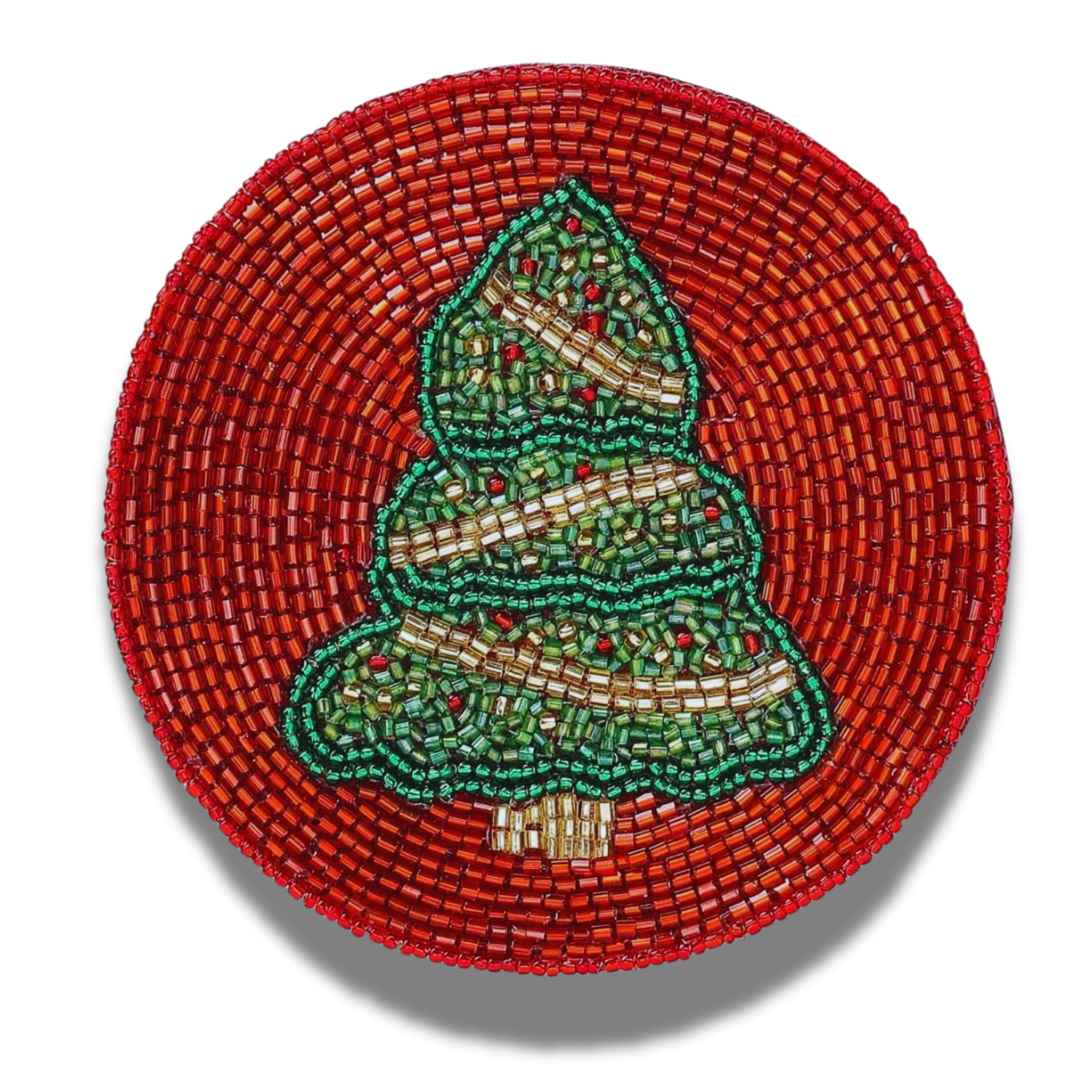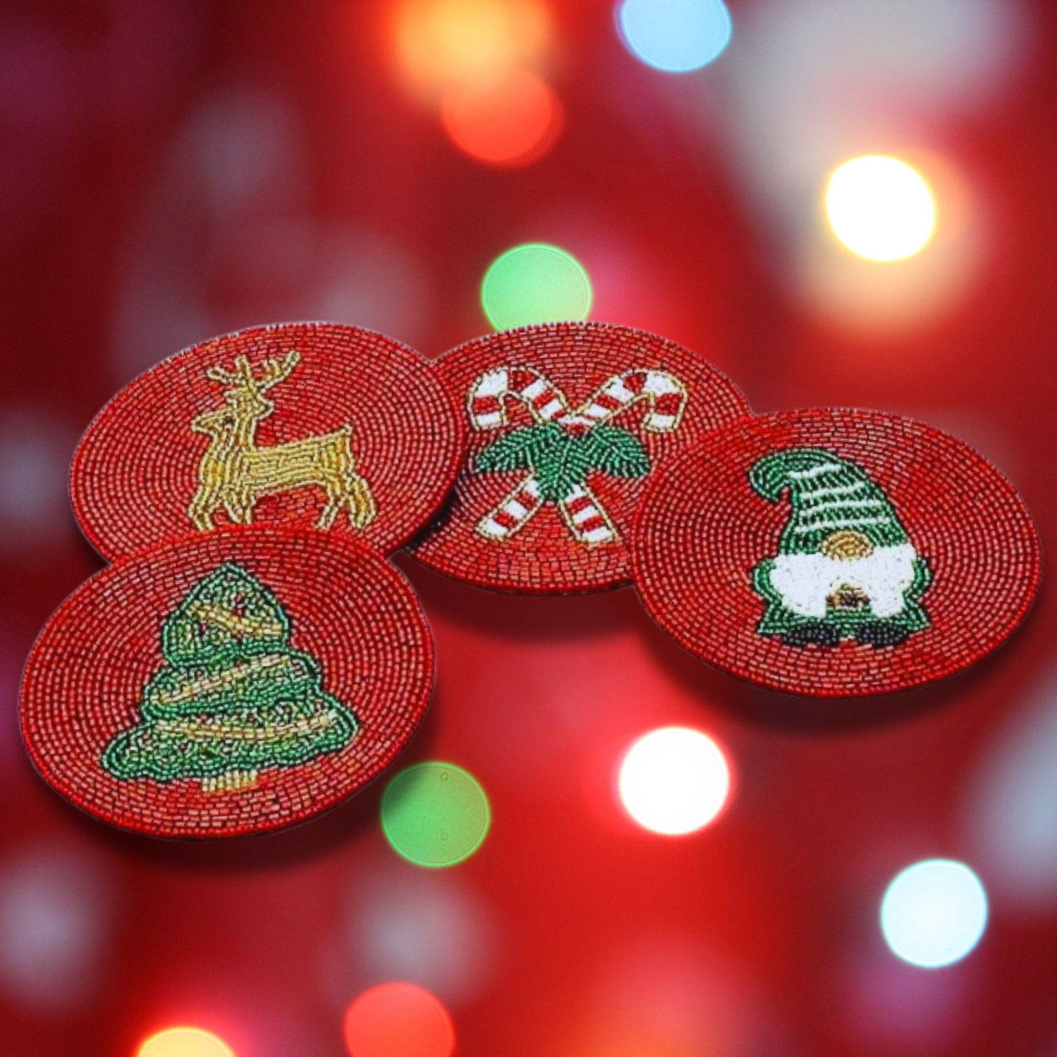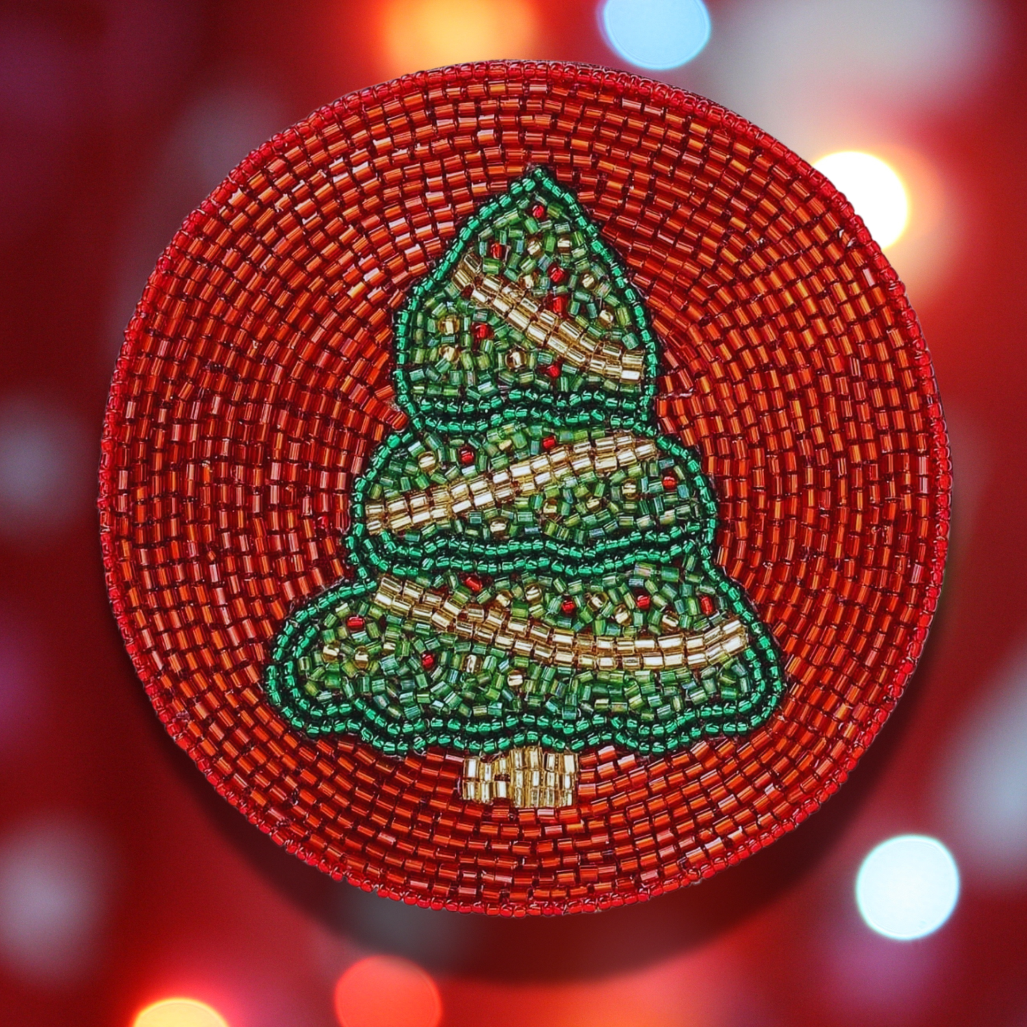 These beaded coasters are handcrafted and add a touch of art and style to your tableware. The coasters feature a Christmas Holiday design in a 4-inch standard design. The beading is intricate and catches the light.