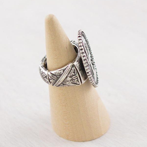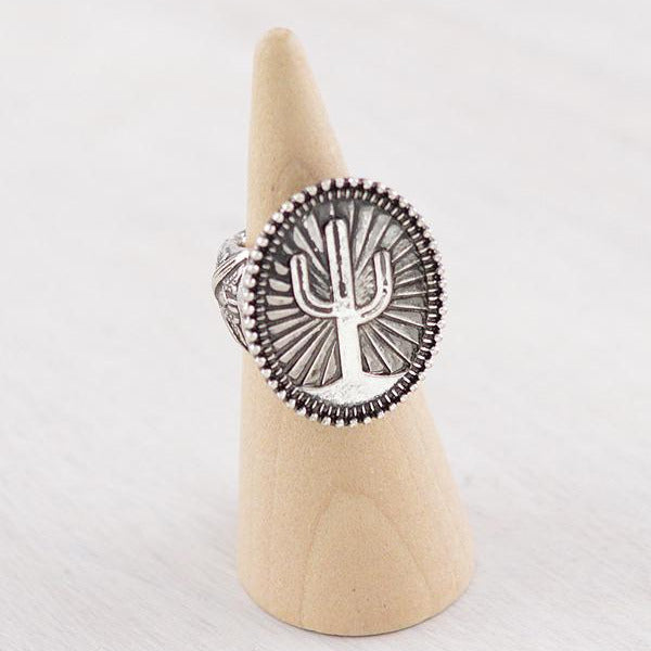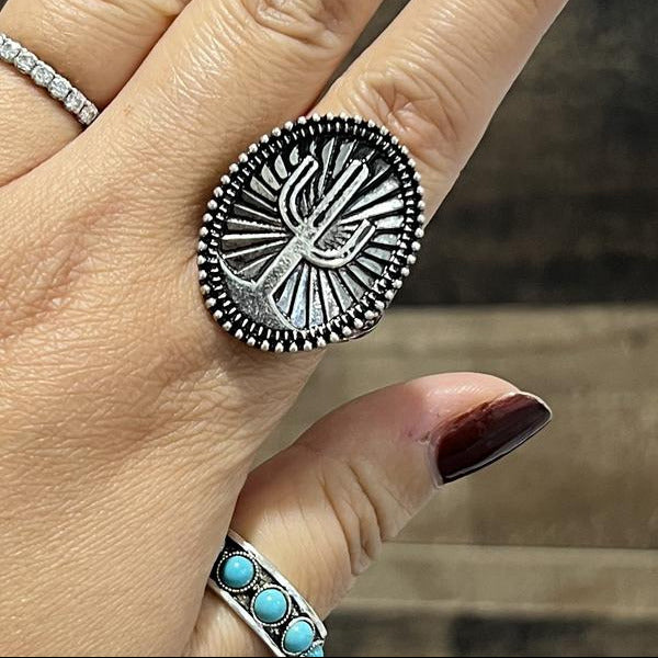 Bring a little desert attitude to your style with the Cowgirl Cactus Concho Ring. This oval silver statement ring features a raised cactus design framed by western concho detailing—capturing the free-spirited essence of the open range. Finished with a polished silver plate and a comfortable cuff-style back, it’s the perfect mix of rugged charm and feminine shine.