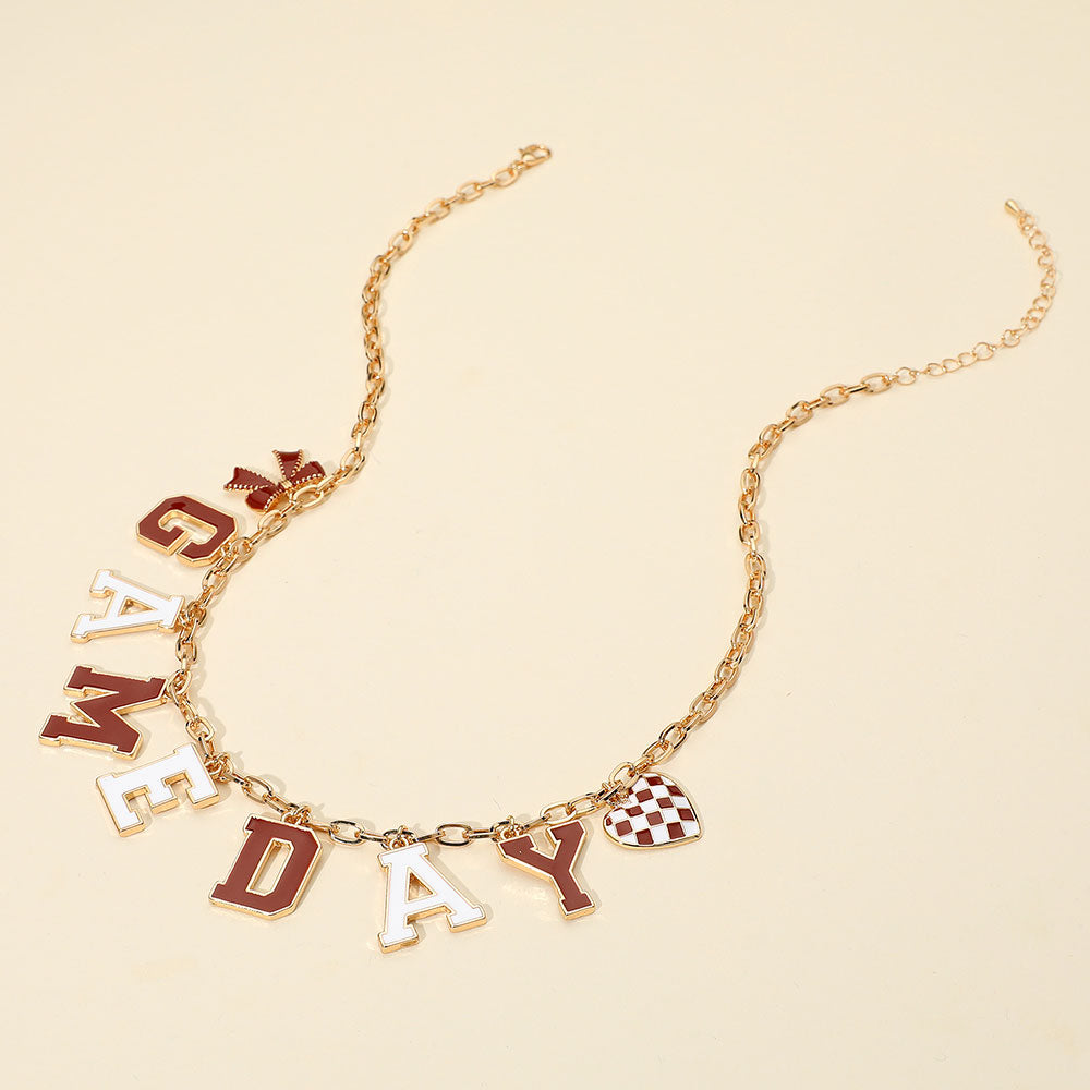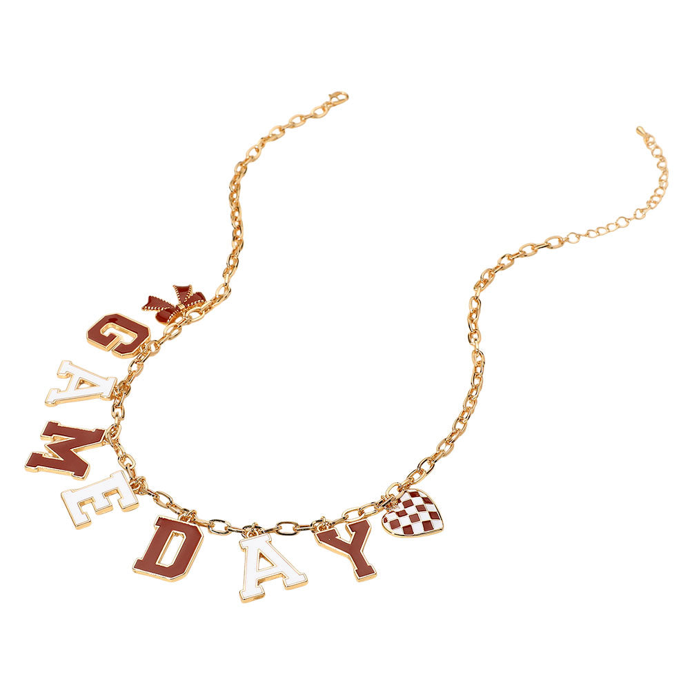 Celebrate your team spirit with this bold GAMEDAY word necklace in crimson and white, featuring playful accent charms. A spirited accessory to complete your outfit for sporting events, tailgates, and fan gatherings.
