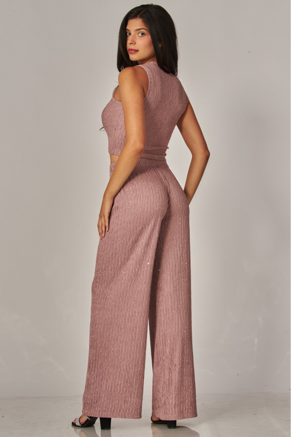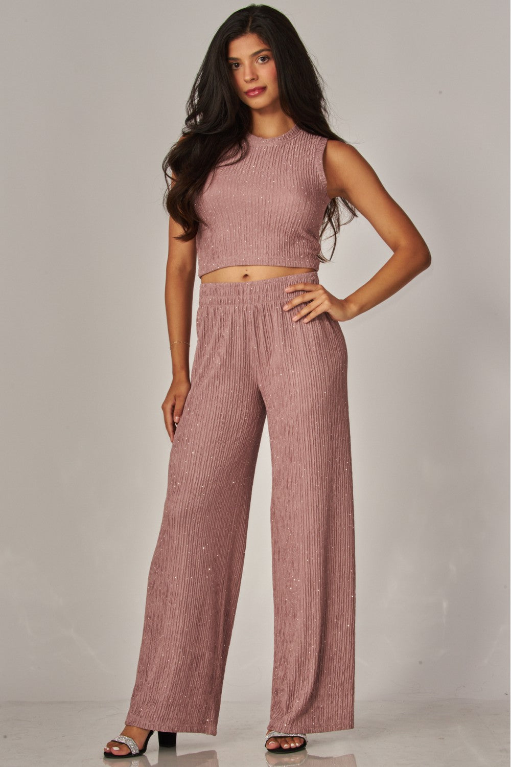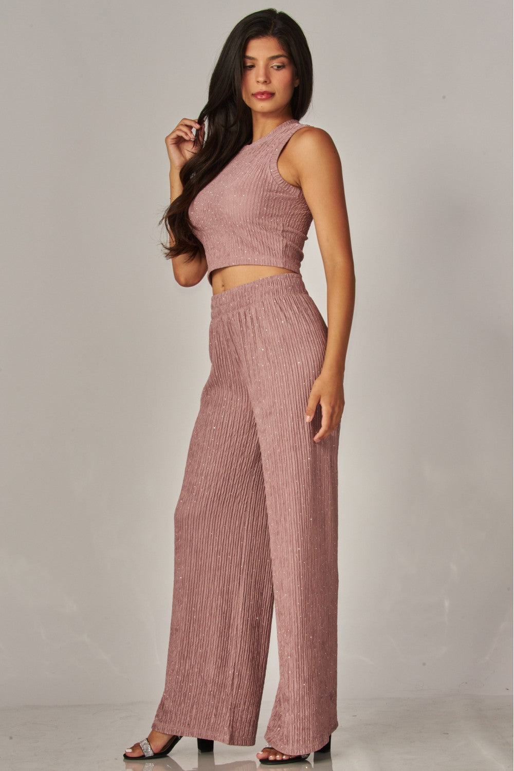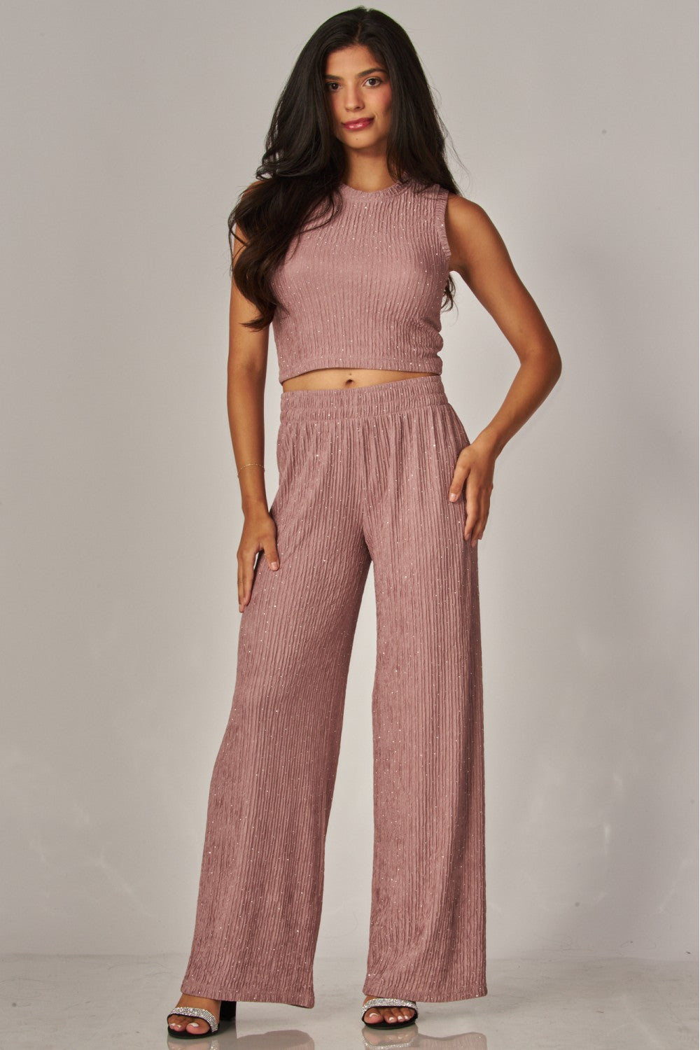 #rhinestonedset #sparkleset #plissetexture #croptopstyle #widelegpants #festivalfashion #casualglam #daytonightstyle #traveloutfit #womensfashion #comfortablechic #shimmerset #elevatedloungewear #nightoutstyle
