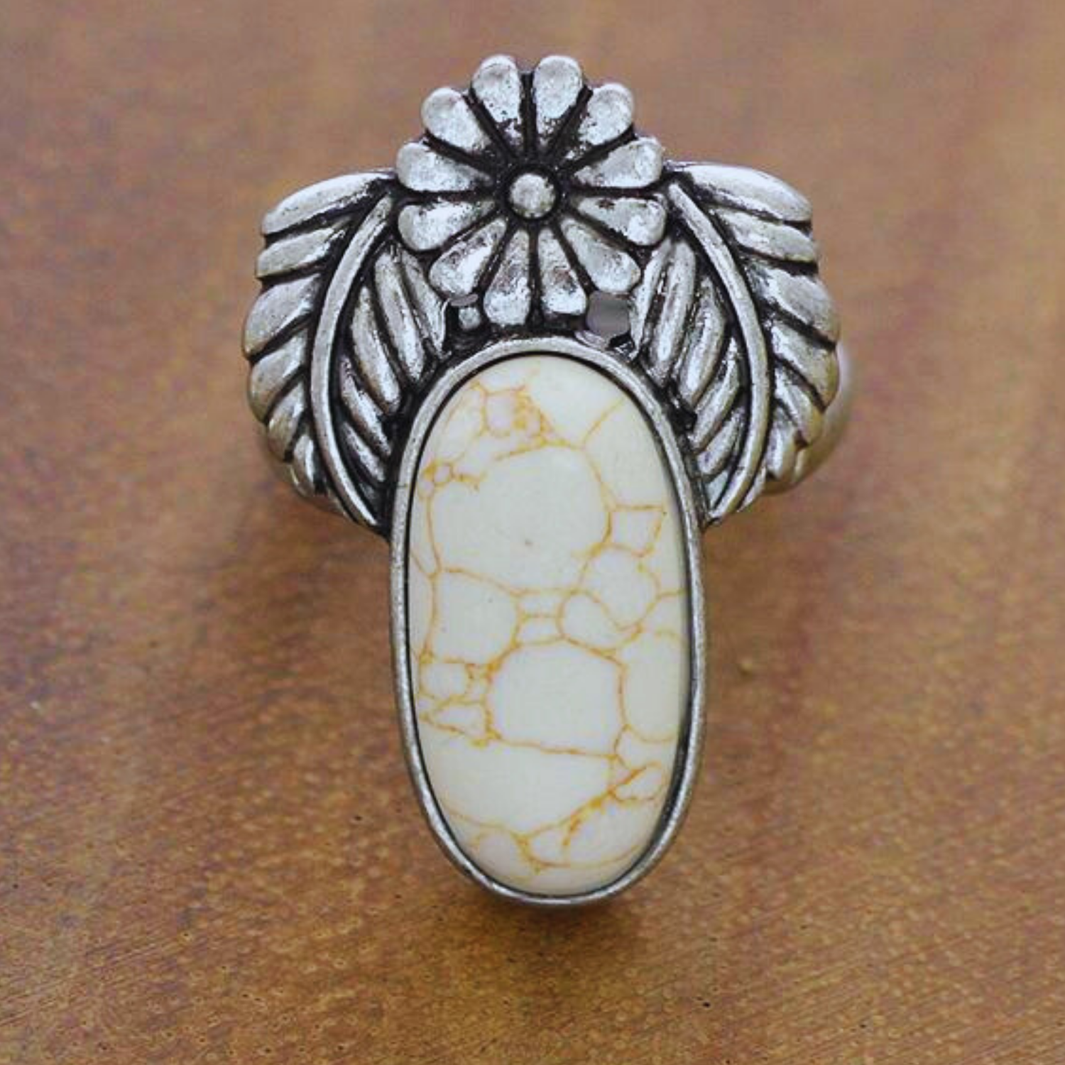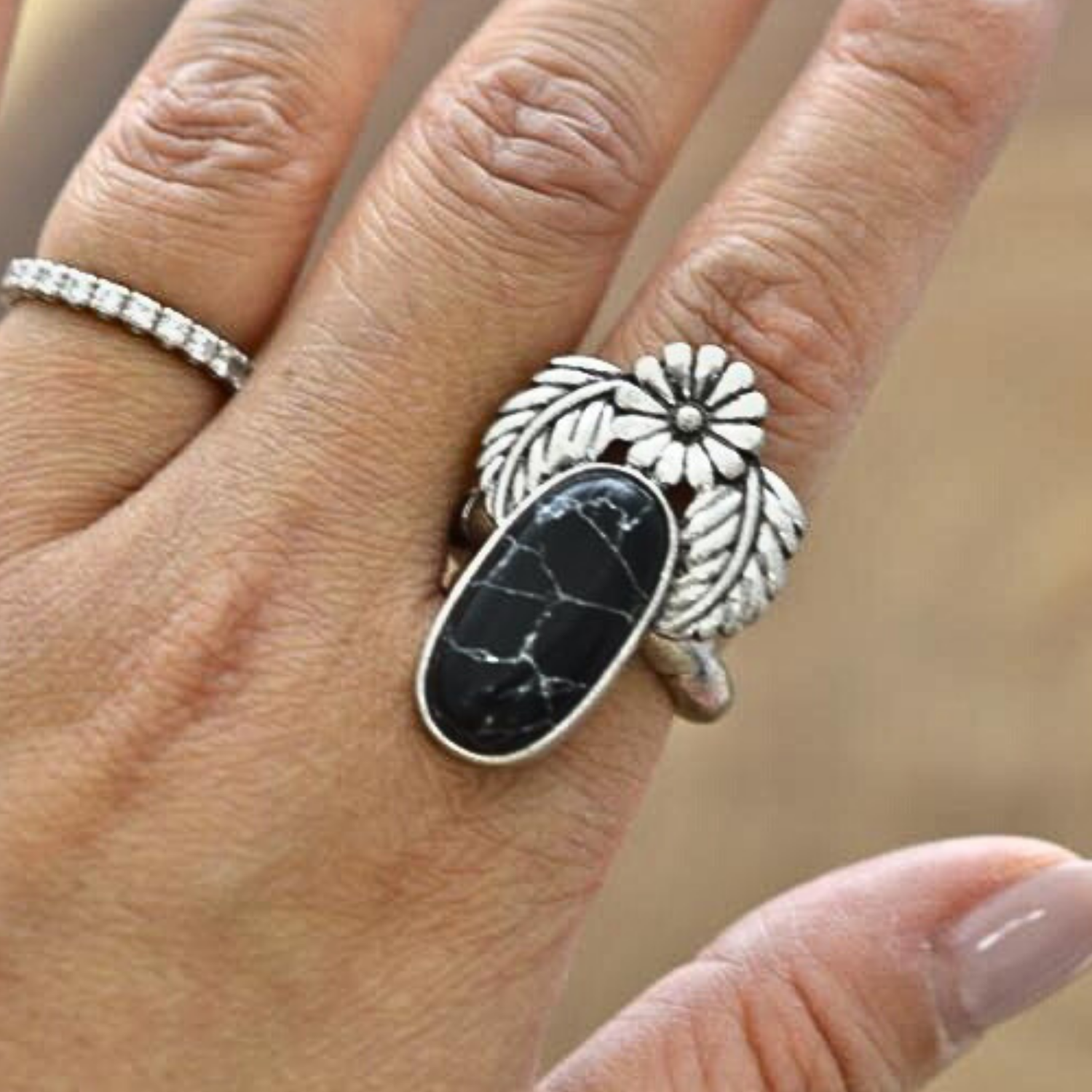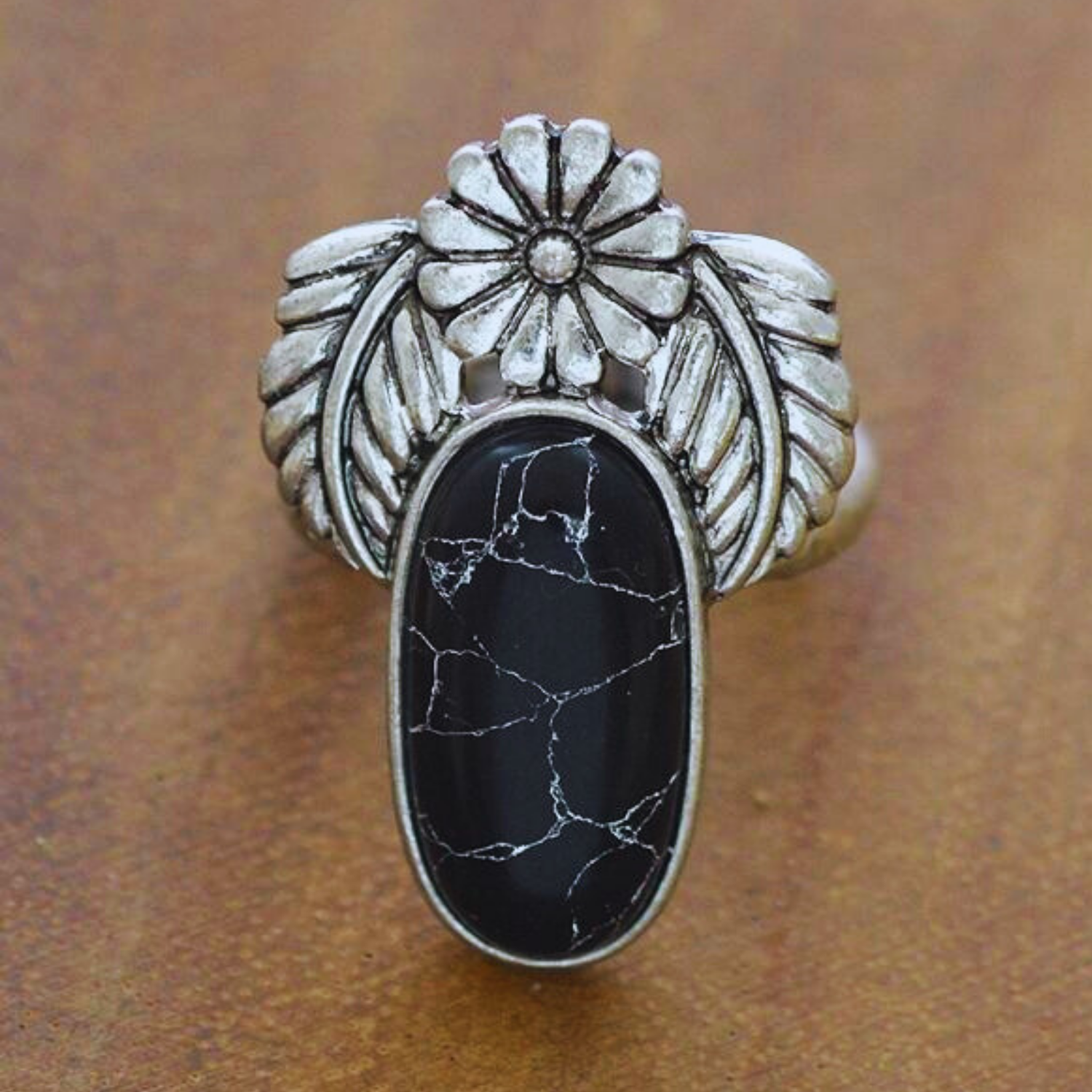#westernjewelry #onyxring #whitering #floralring #statementring #bohowestern #stretchring #cowgirljewelry #electroplatedmetal #womensjewelry #giftforher #madeinusa #rhodeislandmade #westernstyle #countrycharm #everydayglam #festivalstyle #boldaccessories