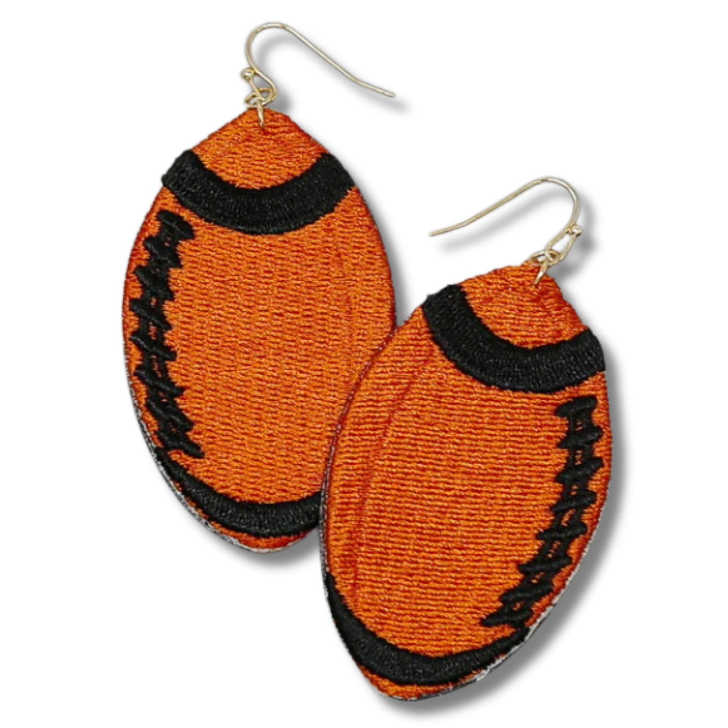 Show your pride with these embroidered football-shaped earrings in bold orange and black team colors. Designed to be featherlight on the ears with hypoallergenic hook fasteners, they add the perfect pop to tailgates, stadium days, and fan outfits.