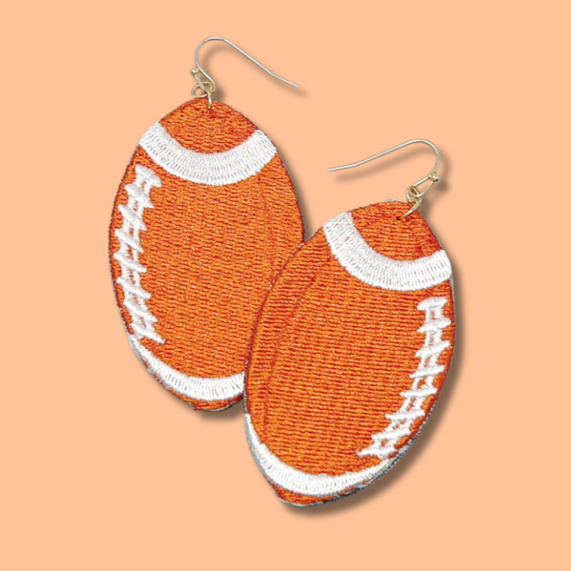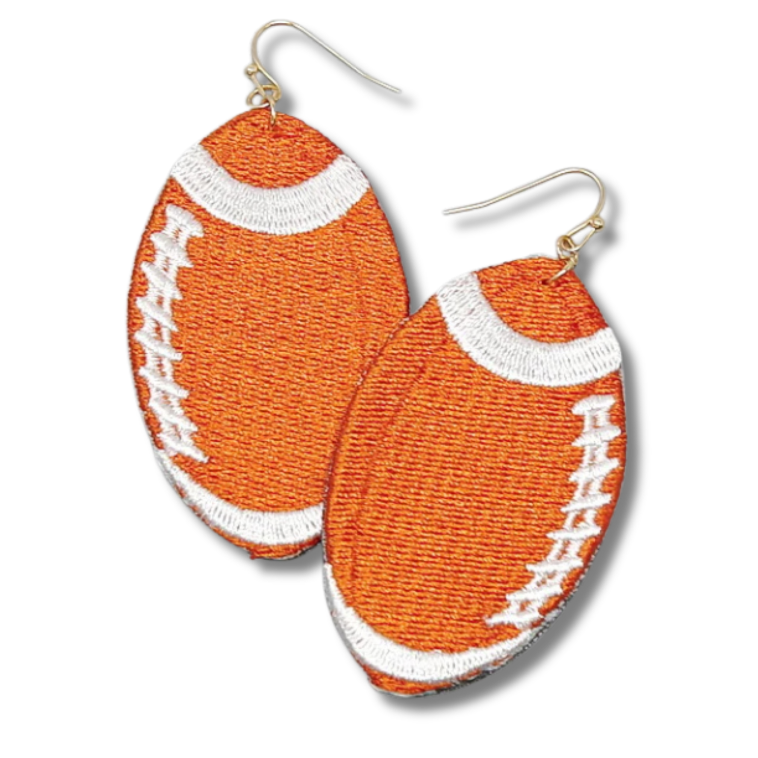 Show your pride with these embroidered football-shaped earrings in bold orange and white team colors. Designed to be featherlight on the ears with hypoallergenic hook fasteners, they add the perfect pop to tailgates, stadium days, and fan outfits.
