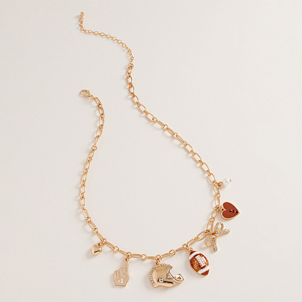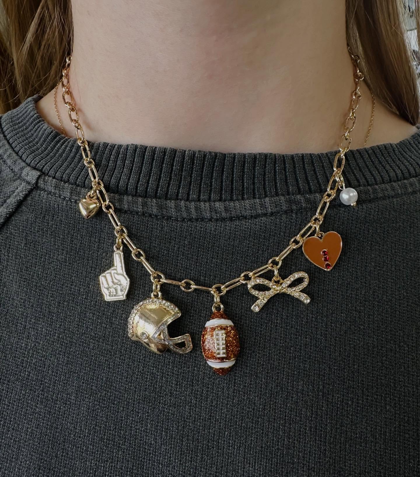 This stylish necklace features football-themed charms — including a rhinestone bow, helmet, ball, and fan-inspired icons — adding a fun, athletic touch to any outfit. Perfect for sports fans, game days, or gifting occasions.