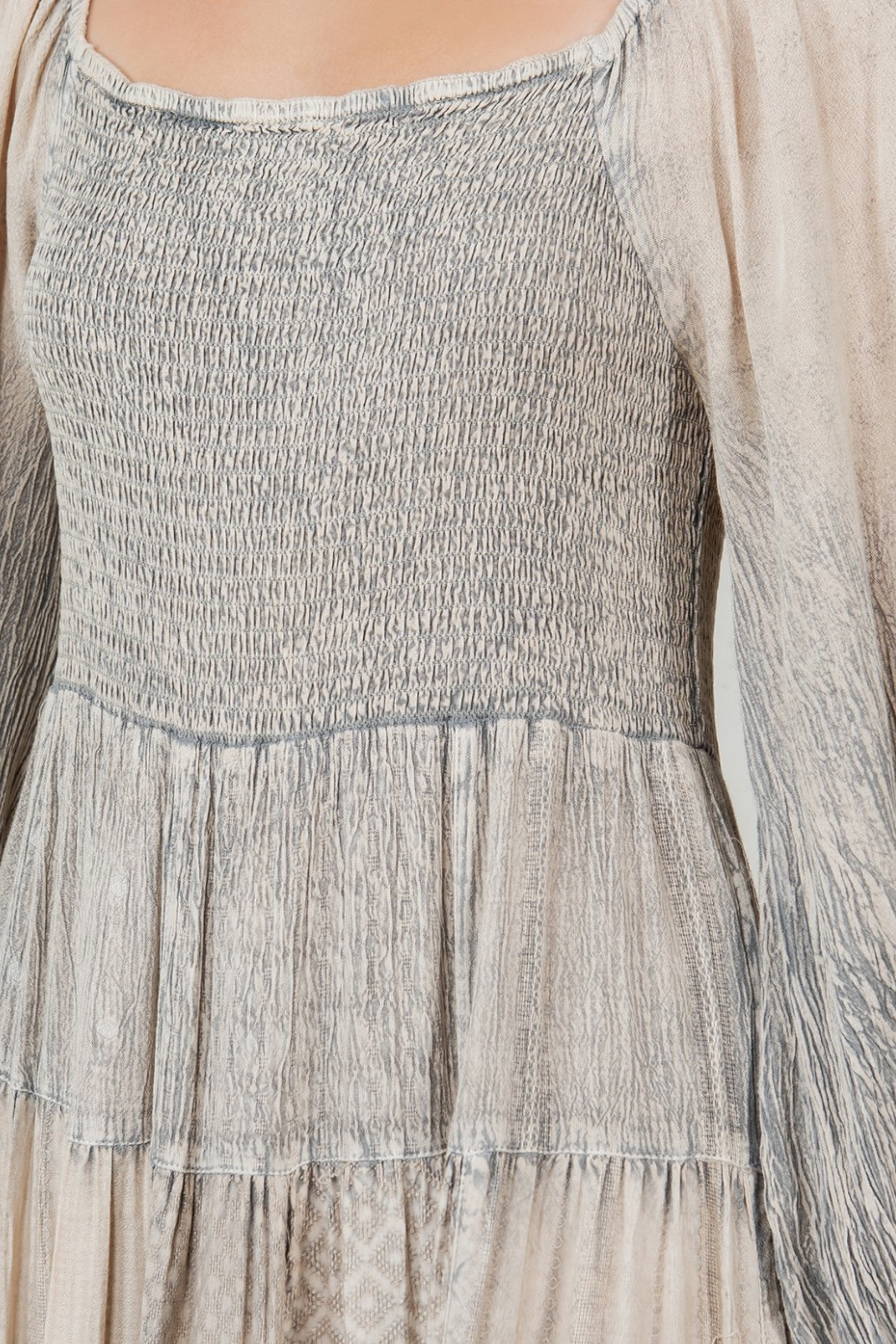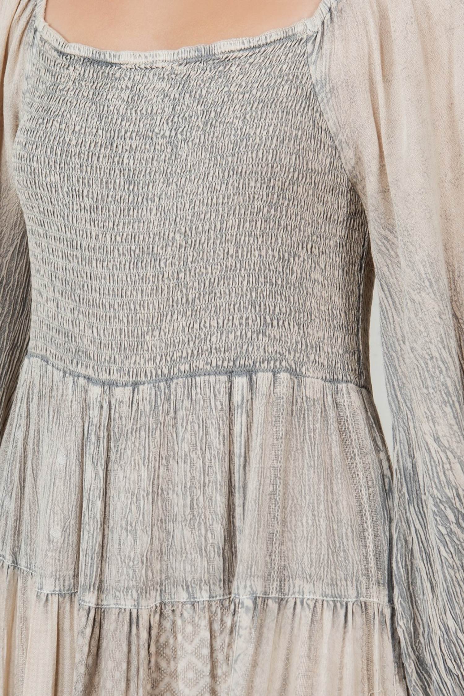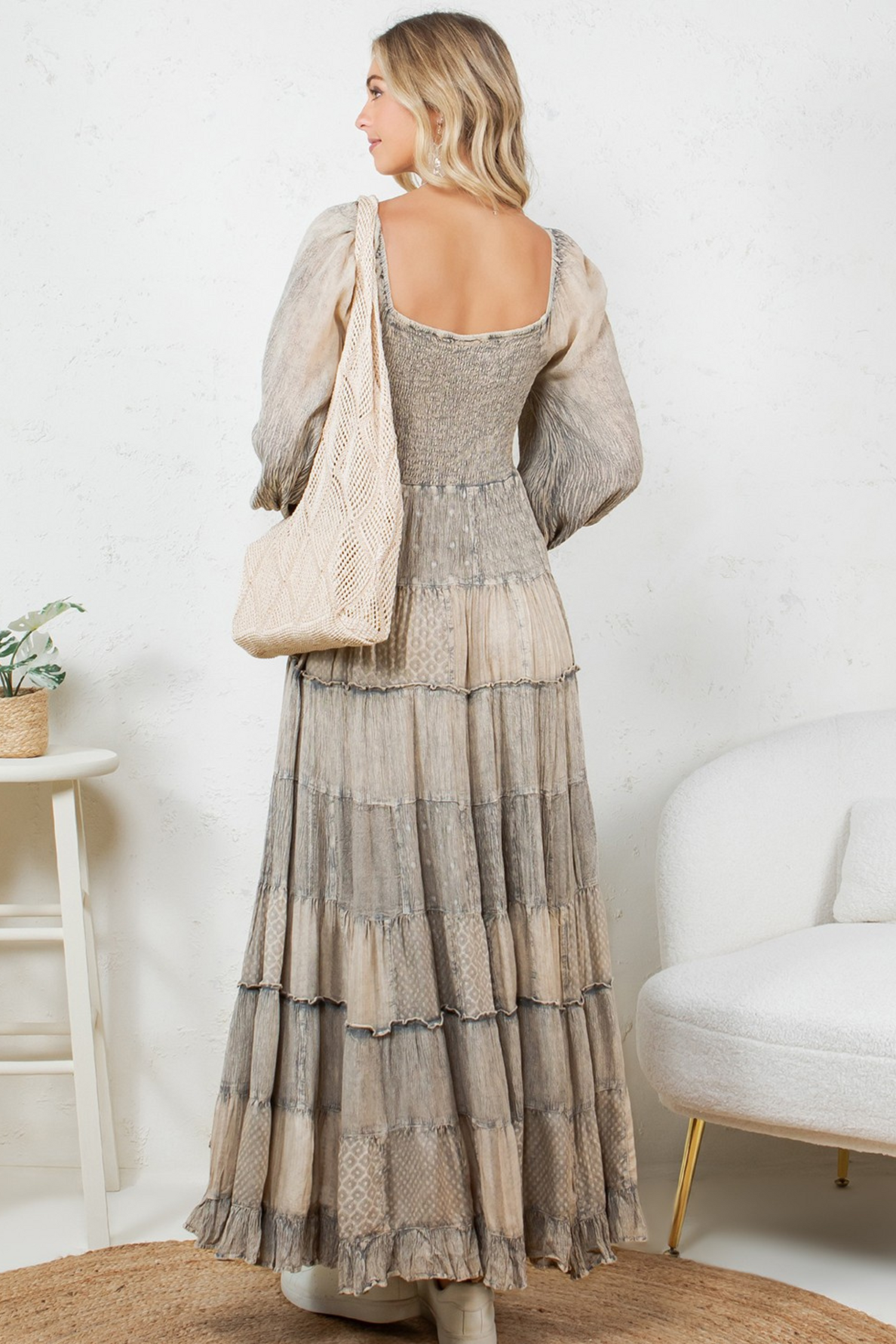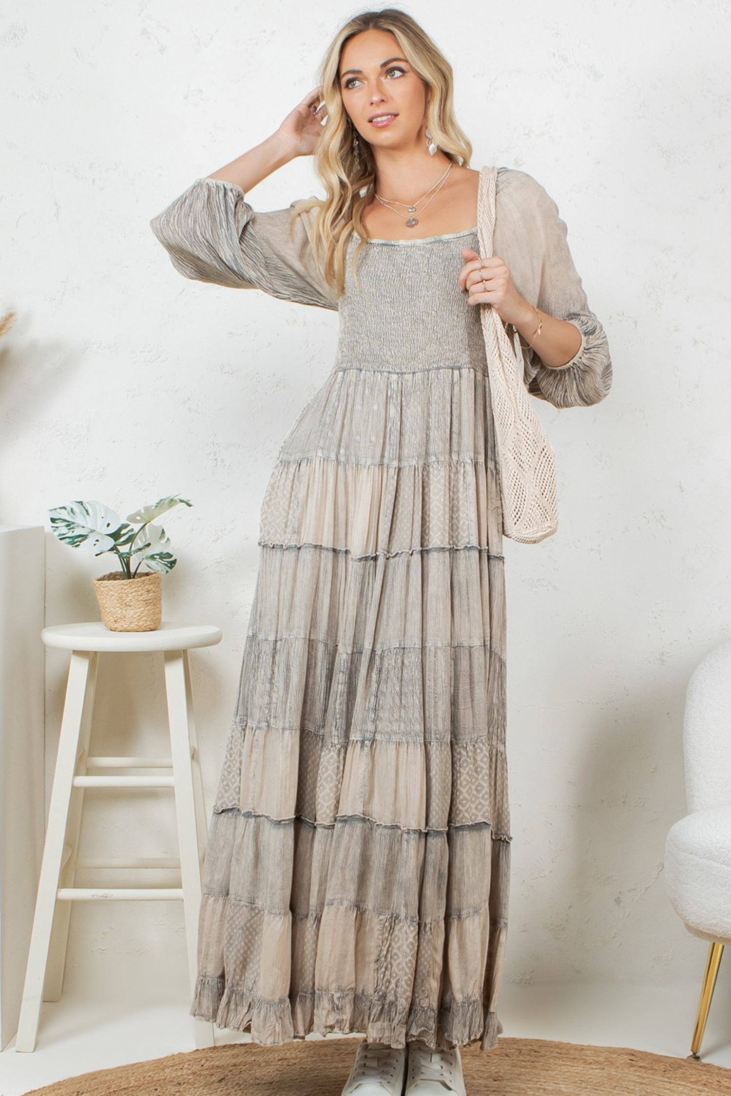 The Forever Folk Song Maxi Dress captures the rustic romance of bohemian, vintage-inspired style. Made from a soft, breathable blend of rayon and cotton, this maxi dress features a harmonious patchwork of earthy prints for an artisanal yet timeless look. The smocked bodice and gently gathered waistline create a flattering, comfortable fit, while the square neckline and 3/4-length sleeves with elastic cuffs add a touch of charm. The tiered skirt flows gracefully with every step, making it perfect for transitioning from relaxed daytime outings to casual evening gatherings.
