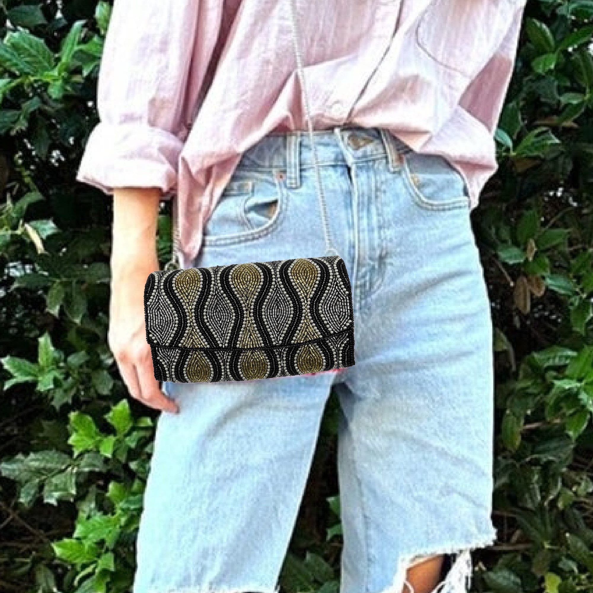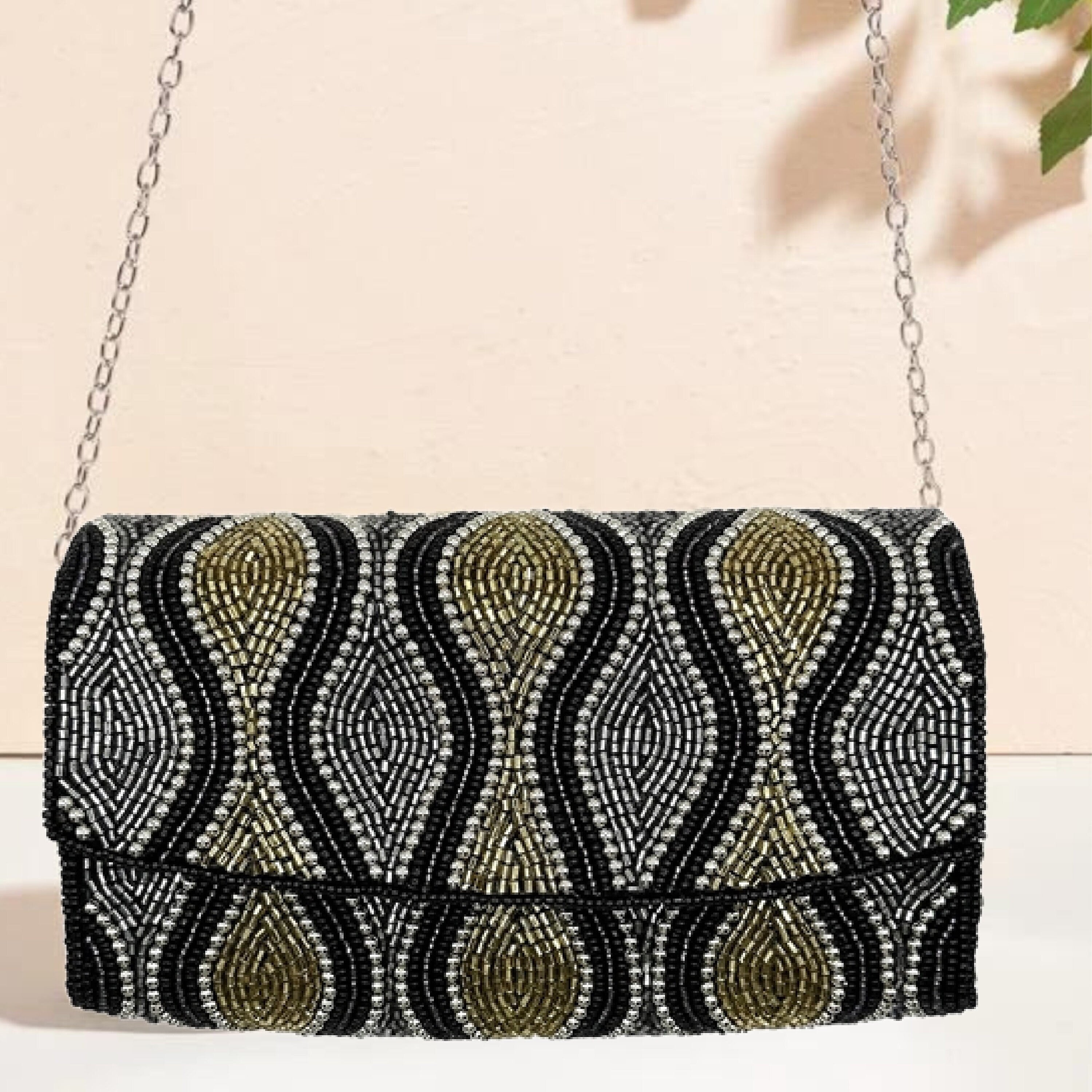 Fully Beaded Black Gold Glam Metallic Crossbody Clutch Handbag