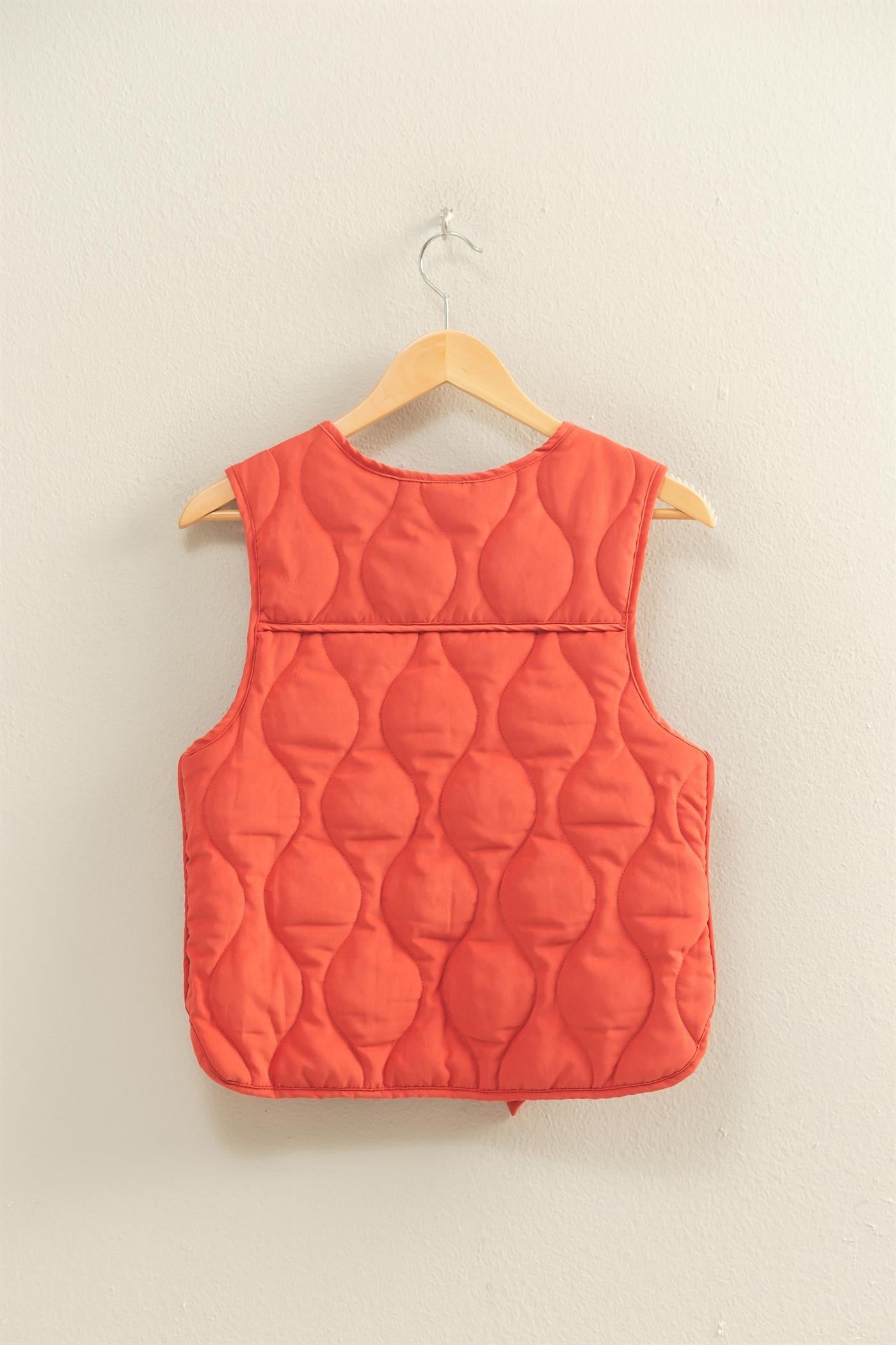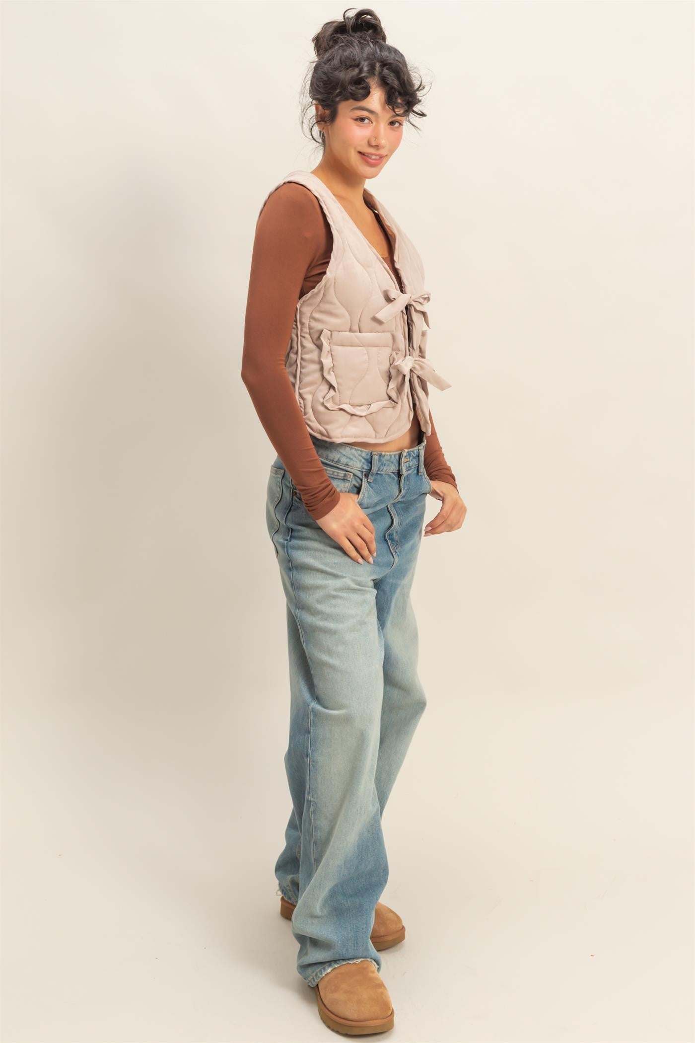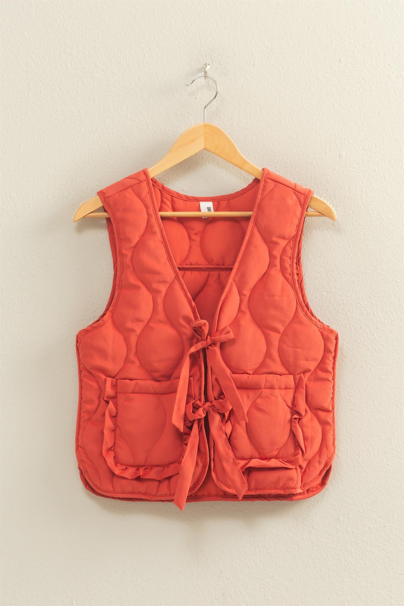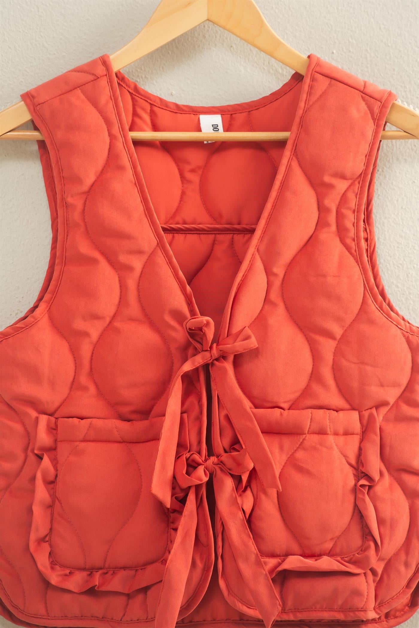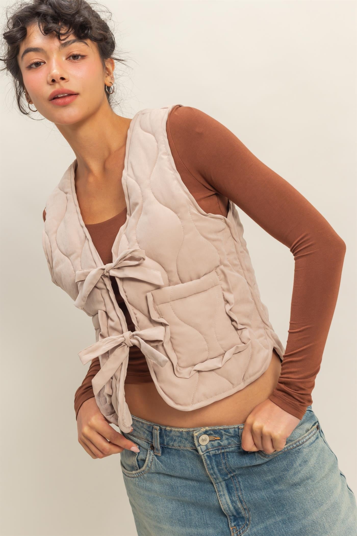 The Go With The Bow Quilted Vest is a soft statement layer designed for effortless femininity. Featuring an intricately quilted pattern with a romantic tie-front closure, this vest adds texture and shape to any outfit. Patch pockets bring practicality while the lightly padded construction provides comfort without bulk. Perfect layered over blouses, turtlenecks, or dresses, it transitions seamlessly between seasons and occasions — from errands to brunch to cozy weekend gatherings.