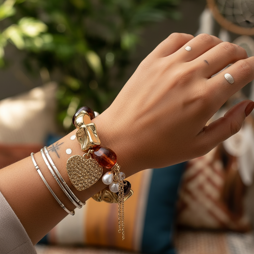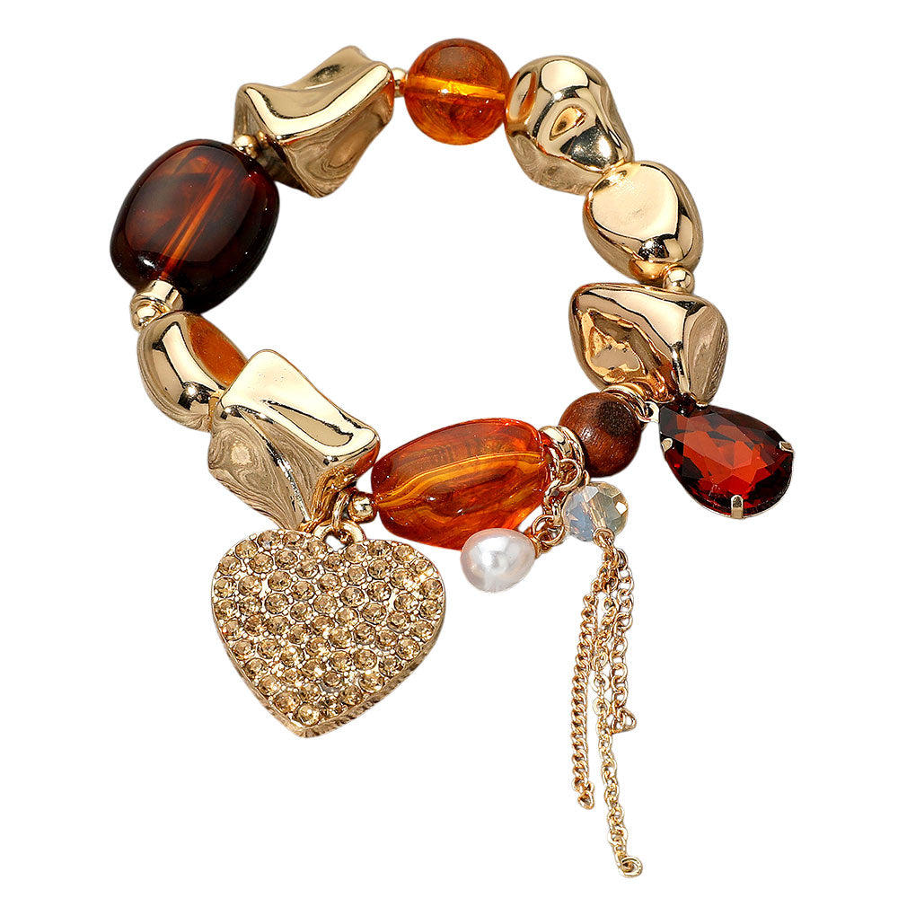 Stylish beaded bracelet featuring mixed beads and charms, including a sparkling heart pendant, teardrop gem, and chain accents.