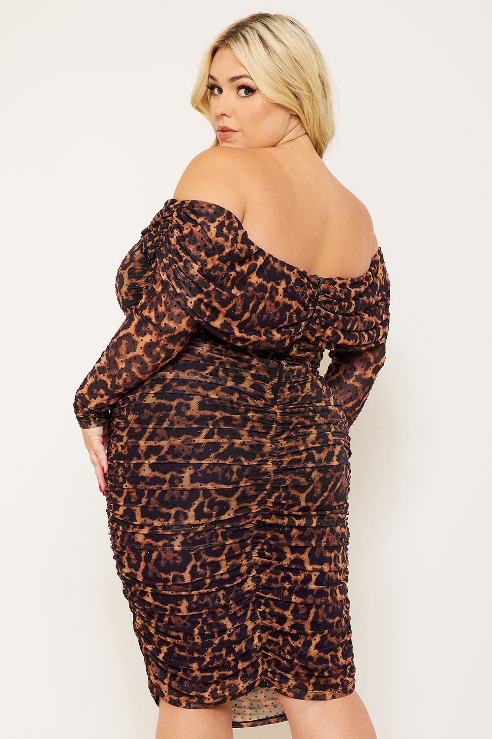 Unleash your wild side with the Hear Me Roar Leopard Rhinestone Dress, a curve-celebrating plus-size midi with a glamorous twist. The bold leopard print is elevated with sparkling rhinestones, while the off-shoulder neckline and sheer long sleeves strike the perfect balance between fierce and feminine. With flattering ruched detail, moderate stretch, and a secure zipper back, this dress is made to hug your curves while keeping you comfortable.