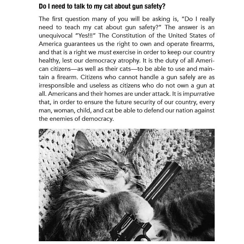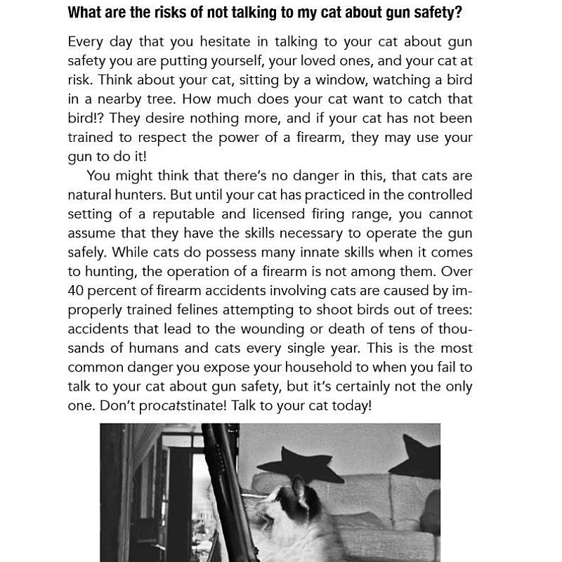 Written in a simple Q&A format, How to Talk to Your Cat About Gun Safety answers crucial questions such as, “What is the right age to talk to my cat about the proper use of firearms?” and “What are the benefits of my cat living a lifestyle of abstinence?” and especially “Why does my cat need to use the internet? Can’t he just play with yarn like cats used to do?”