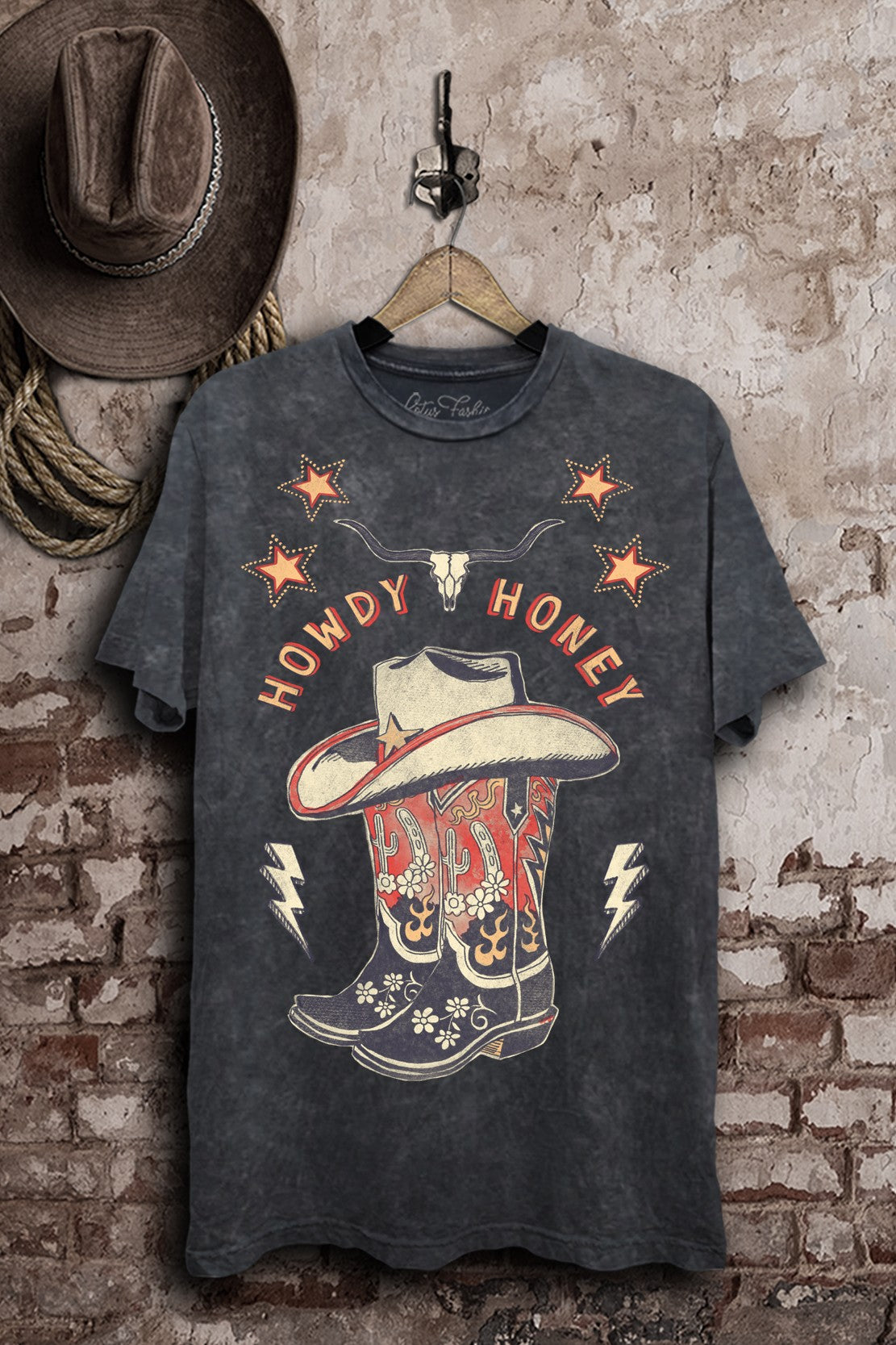 Ride into style with the Howdy Honey Western Boots T-Shirt, a vintage-inspired graphic tee that’s effortlessly cool and endlessly wearable. Crafted in a mineral-washed 100% cotton, this tee is loose in all the right places with a soft drape, an open crew neckline, and slightly dropped sleeves for that laid-back retro vibe. Featuring an exclusive hand-drawn design, silk-screened in-house at our Los Angeles studio, this top is as original as it gets.