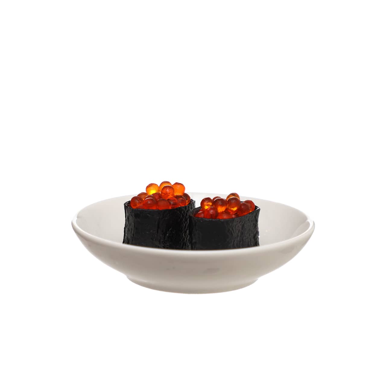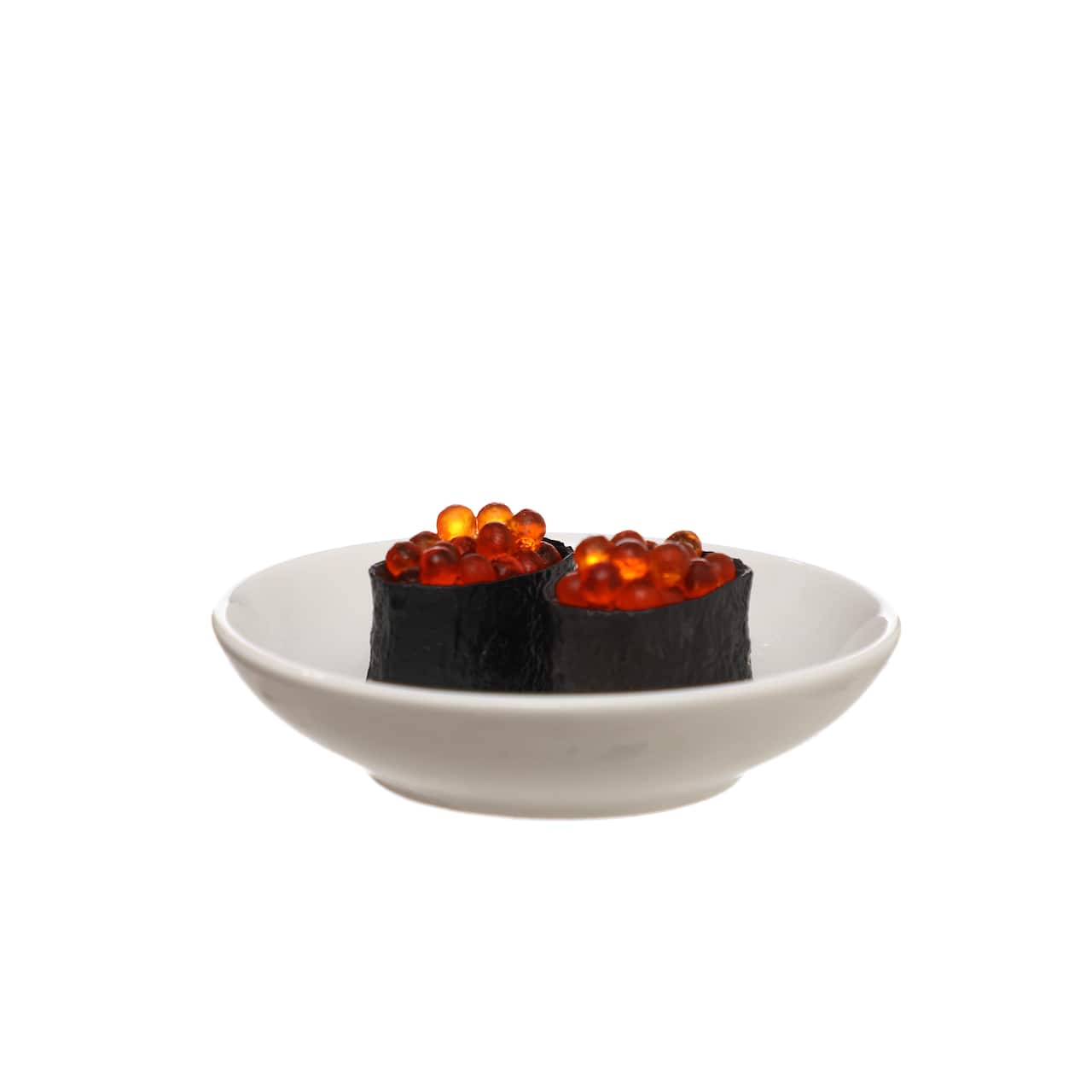 Add a bright pop of color to your living space with this tabletop accent featuring a white plate with an ikura roll that looks good enough to eat!