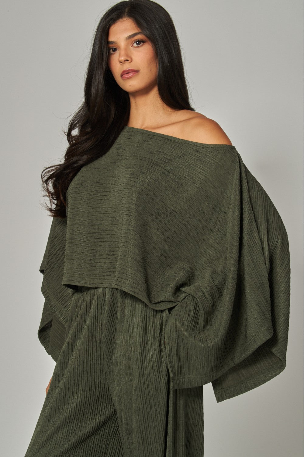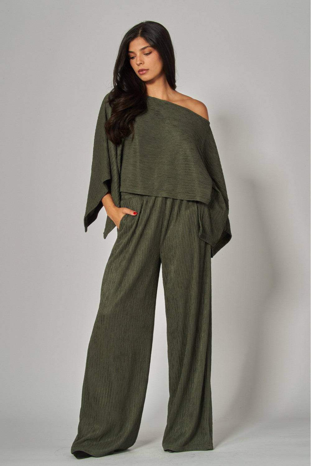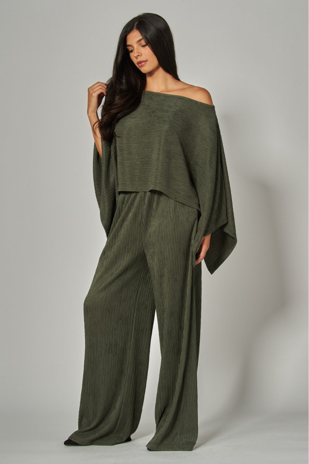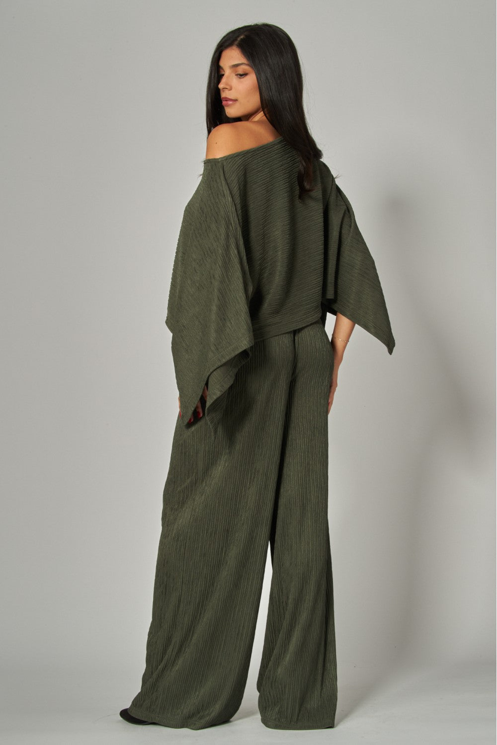 The cape-style kimono top features an O-neck and wide long sleeves that drape effortlessly over the frame. Paired with matching wide-leg pants, this ensemble creates graceful movement with every step and offers a relaxed silhouette that still reads polished.
