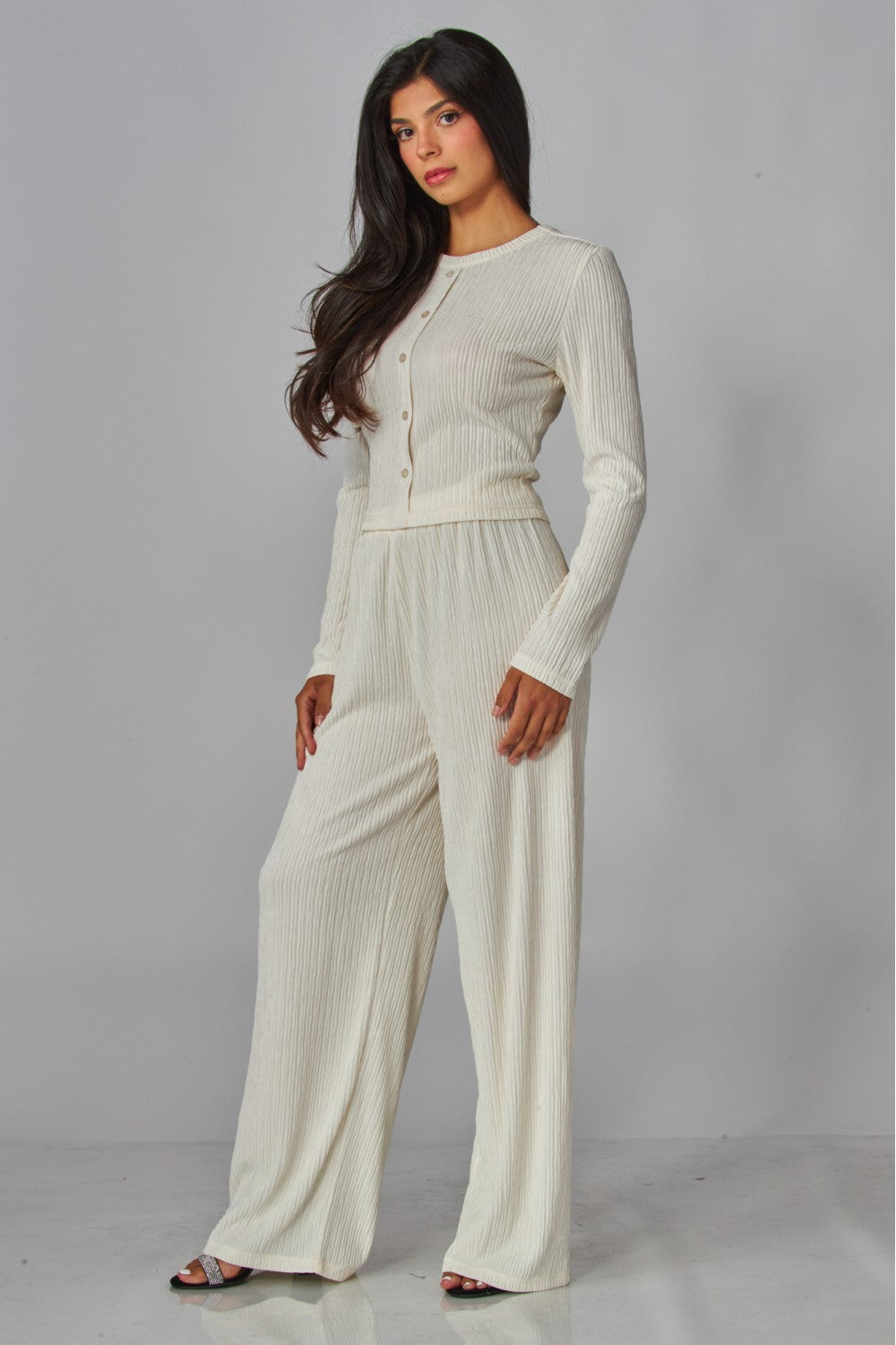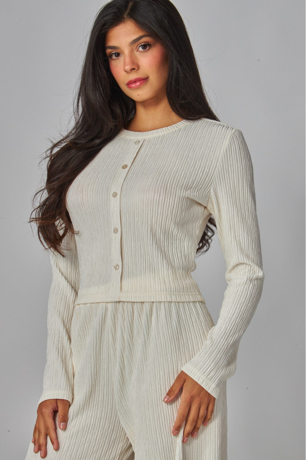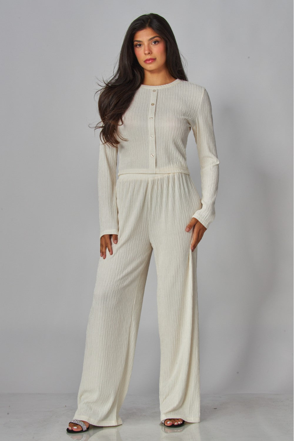 The License To Lounge Pants Set is your new “out the door or back to bed” uniform. Crafted in a soft, finely pleated plissé, this matching button-front top and relaxed wide-leg pant drape with an easy elegance. Effortlessly polished, endlessly comfortable, and ready for anything from brunch to binge-watching.