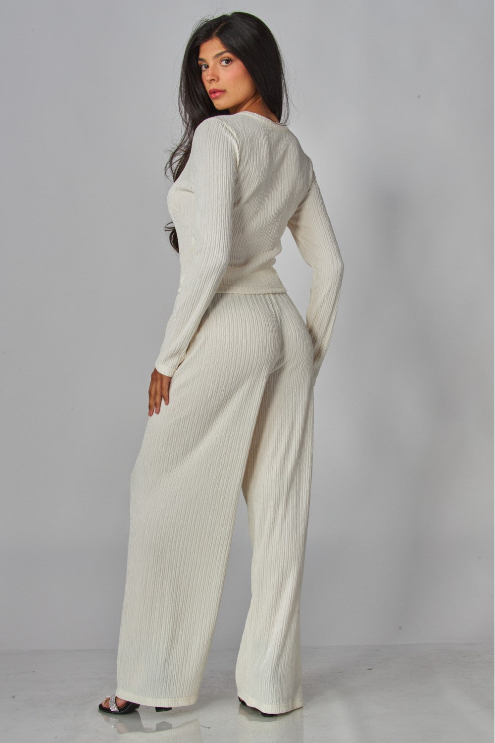 Dress it up with heeled sandals and layered gold jewelry, or lean into lounge mode with soft slides and a messy bun. The top pairs beautifully with denim; the pants with a sleek tank or fitted tee.