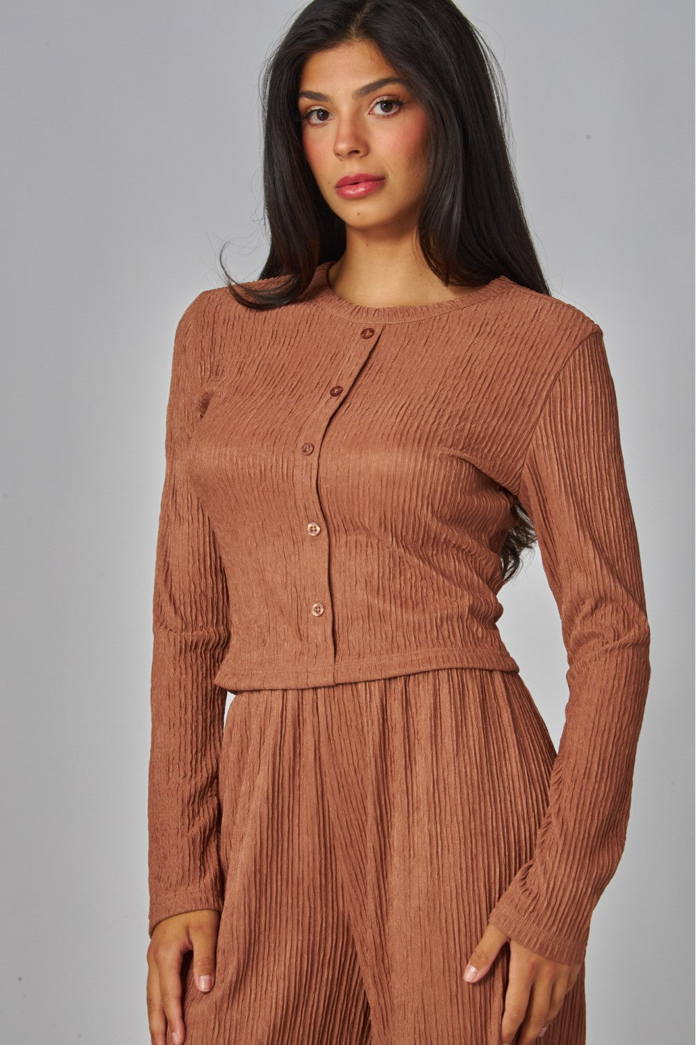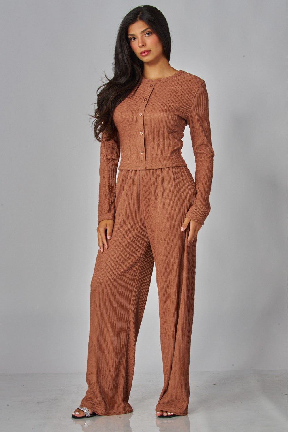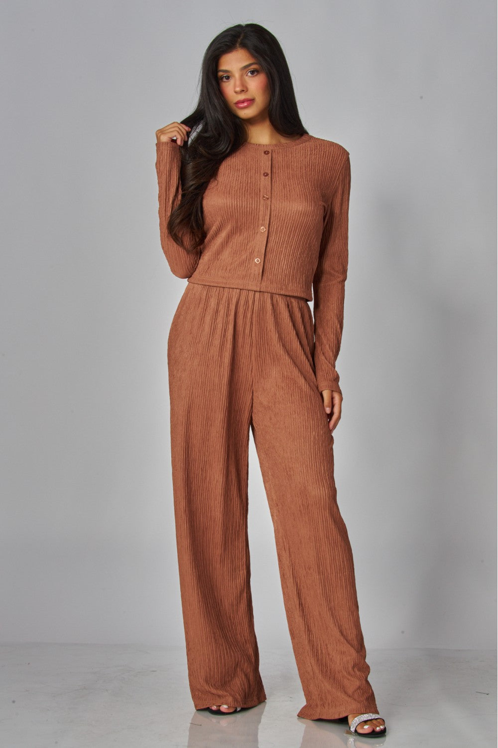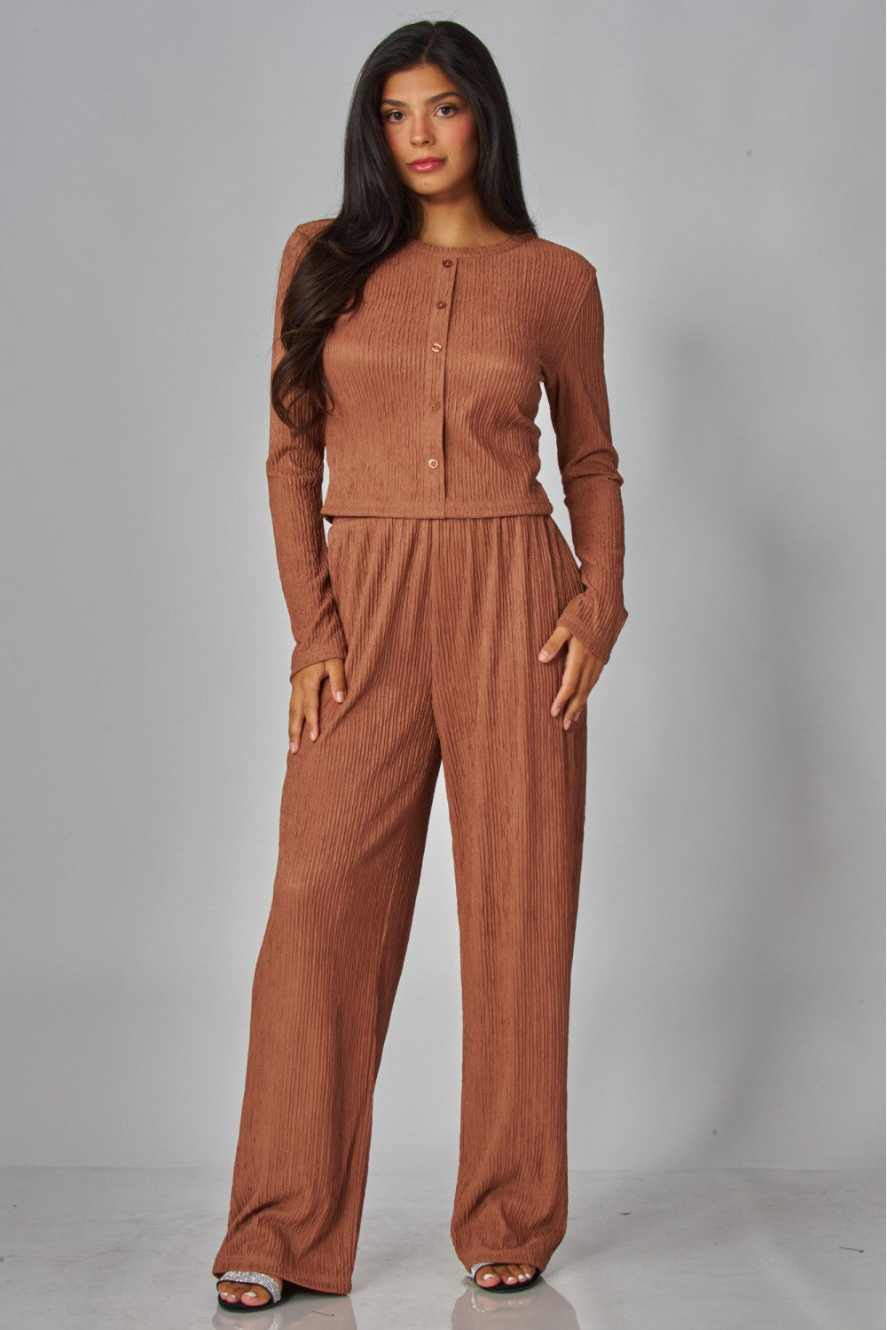 The License To Lounge Pants Set is your new “out the door or back to bed” uniform. Crafted in a soft, finely pleated plissé, this matching button-front top and relaxed wide-leg pant drape with an easy elegance. Effortlessly polished, endlessly comfortable, and ready for anything from brunch to binge-watching.