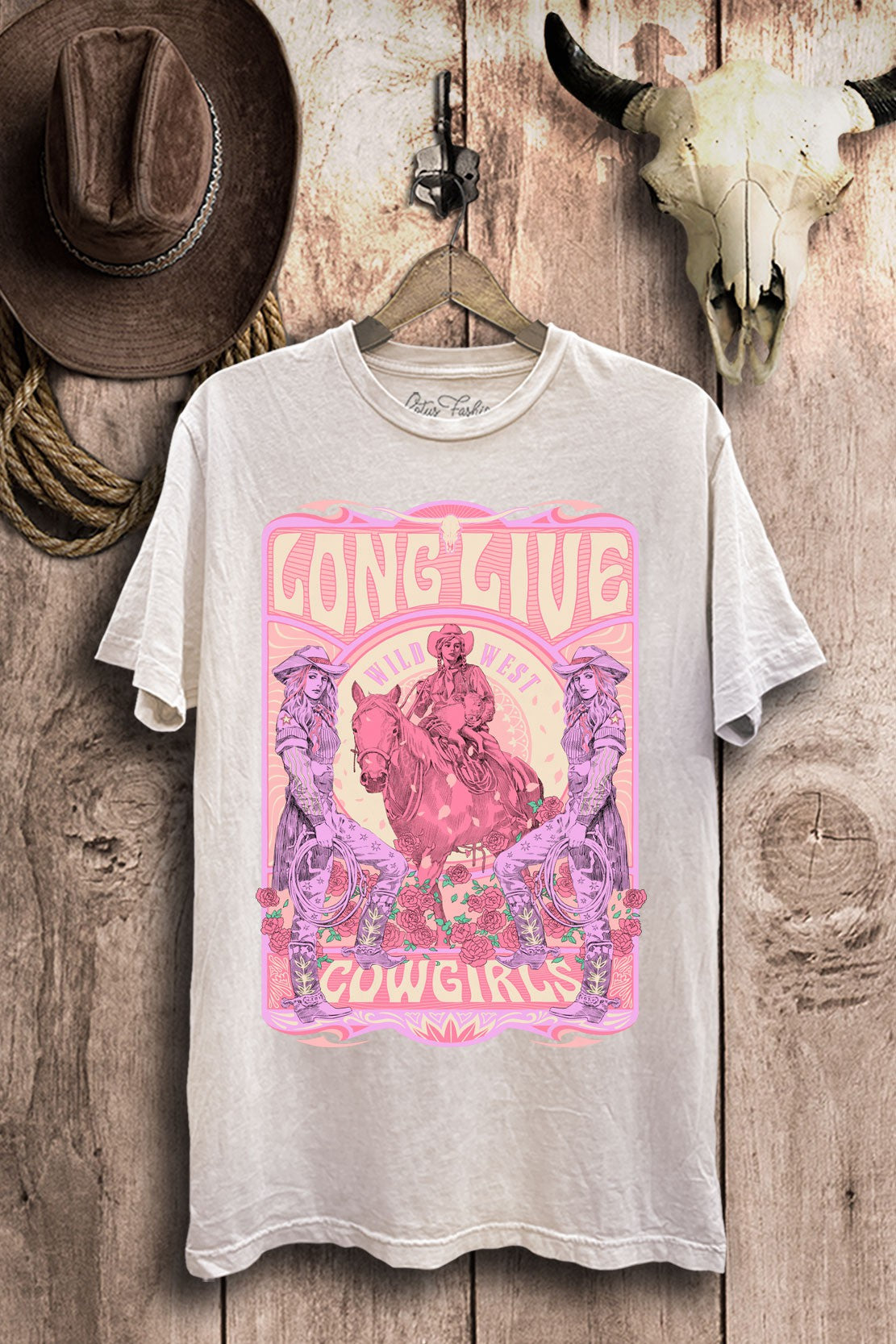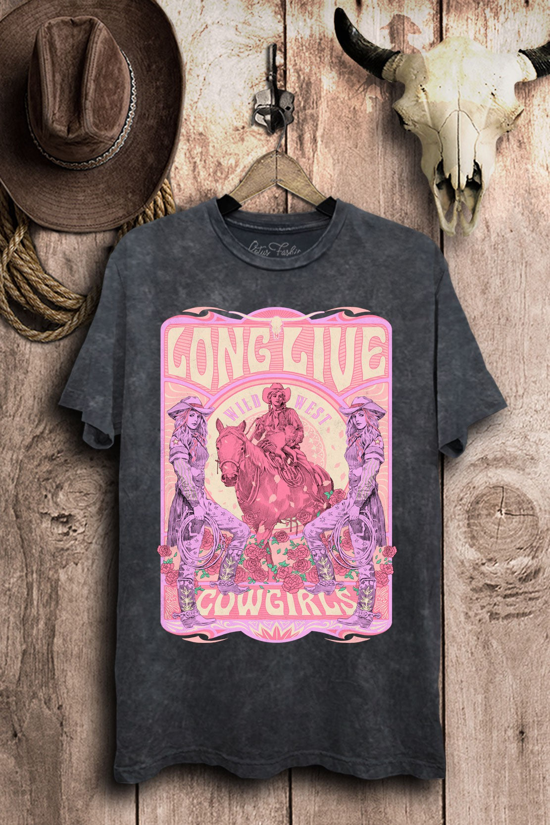 Ride into style with the Long Live Cowgirls Western Graphic T-Shirt -- a vintage-inspired graphic tee that’s effortlessly cool and endlessly wearable. Crafted in a mineral-washed 100% cotton, this tee is loose in all the right places with a soft drape, an open crew neckline, and slightly dropped sleeves for that laid-back retro vibe. Featuring an exclusive hand-drawn design, silk-screened in-house at our Los Angeles studio, this top is as original as it gets.