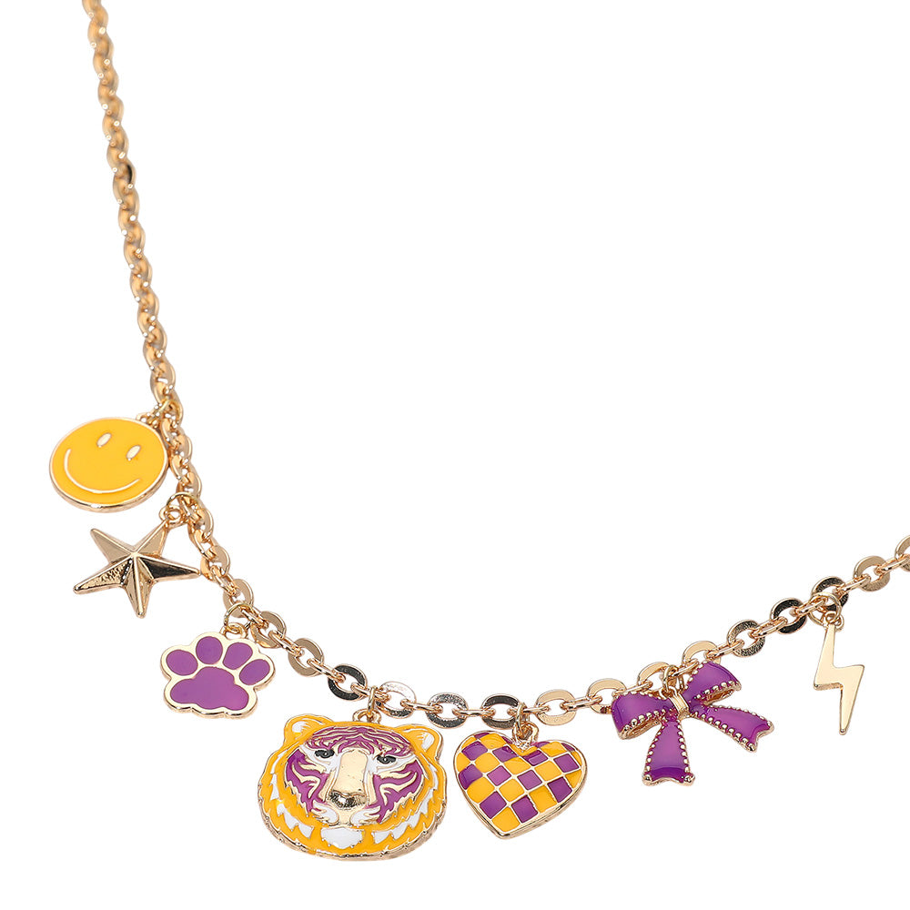 This layered gameday necklace features playful charms — including a team mascot animal, paw, heart, bow, star, lightning bolt, and smiley face — bringing fun personality to any fan look. Its spirited design pairs perfectly with tees, jerseys, and sporty gameday outfits.