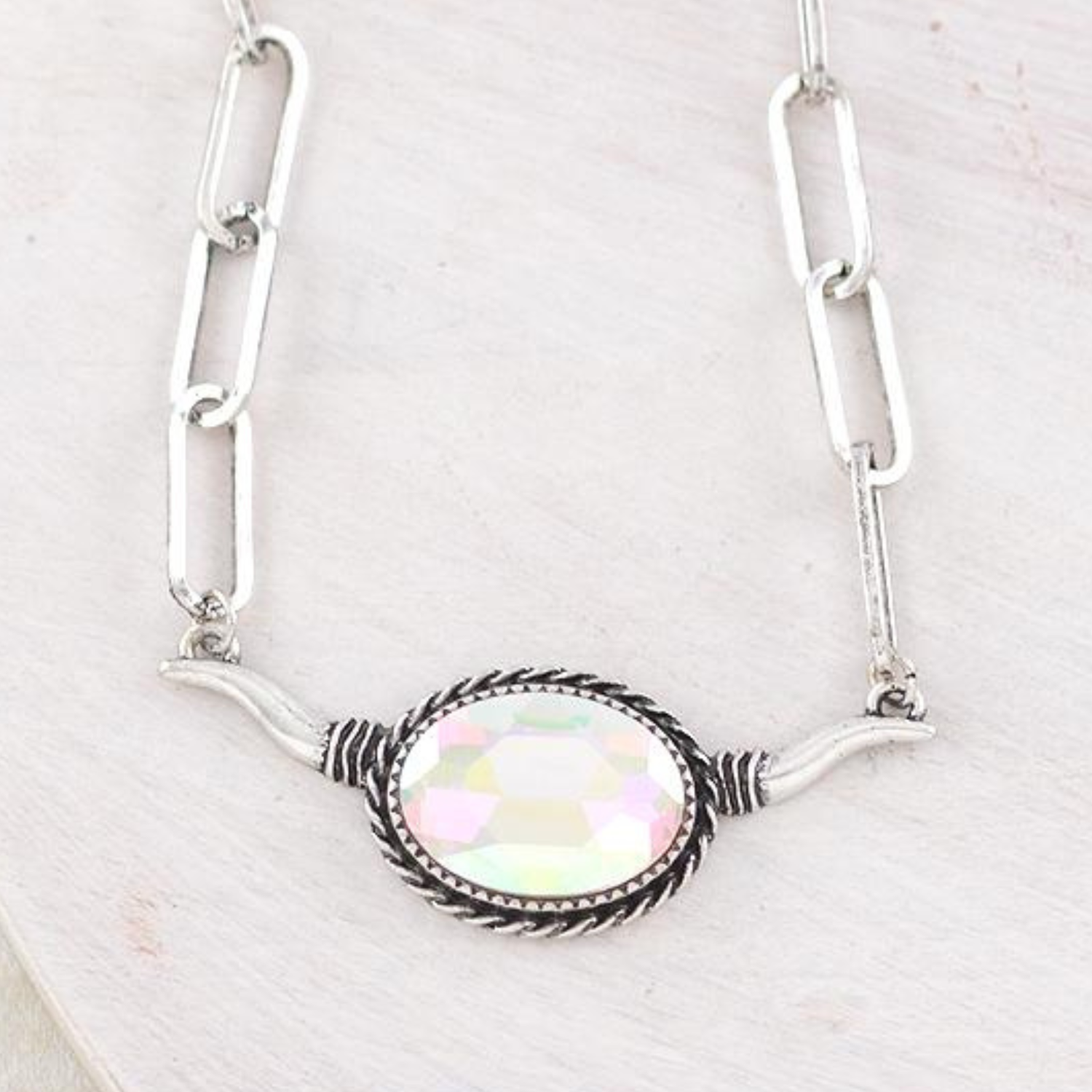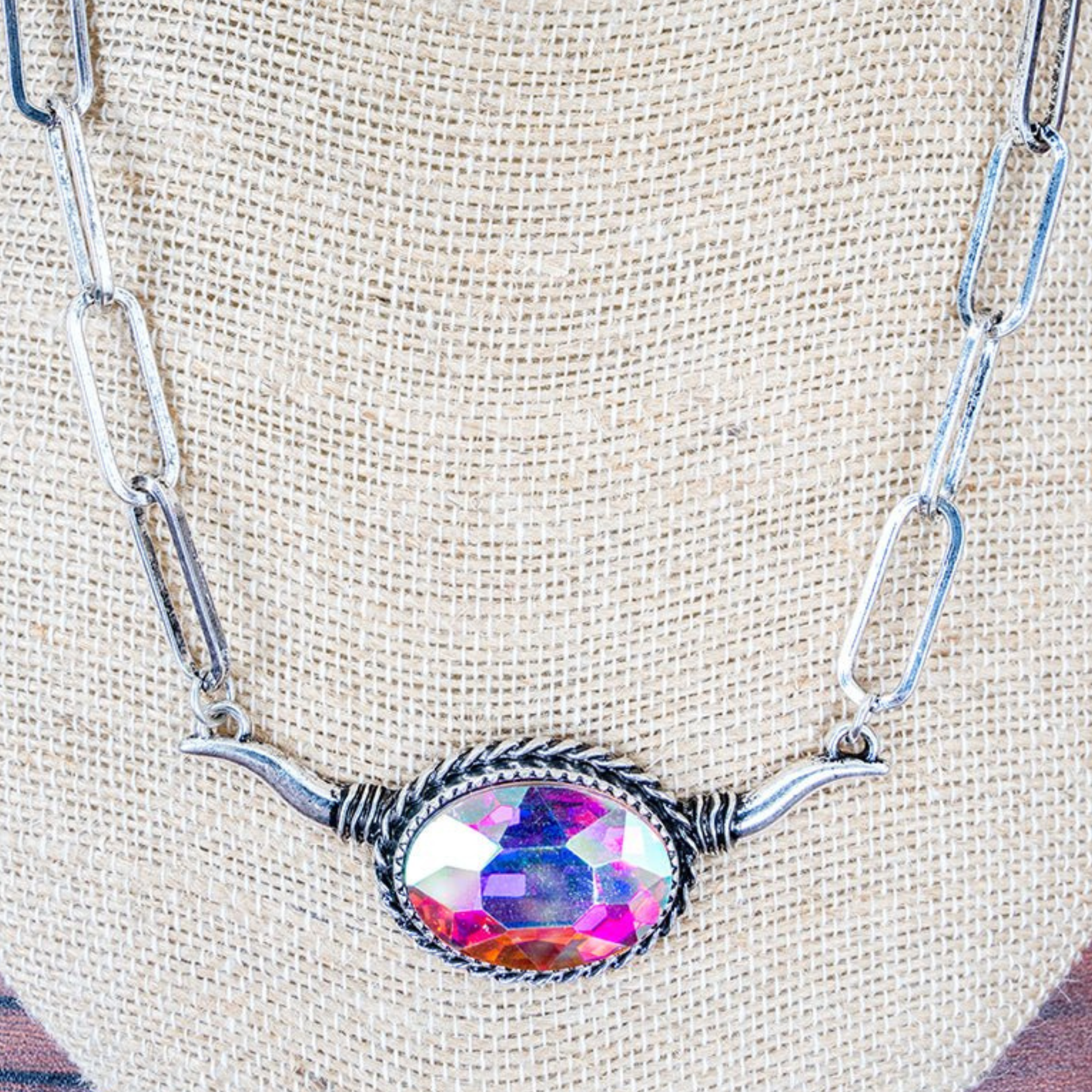 Western grit meets glitzy glamour in the Luminous Longhorn Western Necklace — a sparkling statement piece that captures rodeo spirit with sophisticated shine. The iridescent rhinestone center crystal and burnished silvertone finish bring dazzling light to your favorite cowgirl look, while rope-textured edges and horn details add authentic western flair.