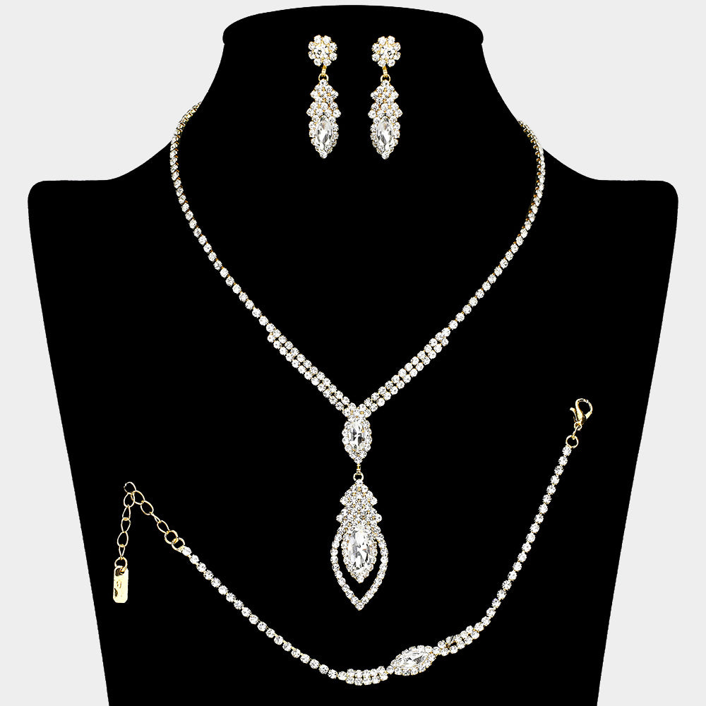 Gorgeous, Sparkling Set includes a necklace, bracelet and earrings all with crystals and rhinestones in a hypoallergenic gold or silver setting.