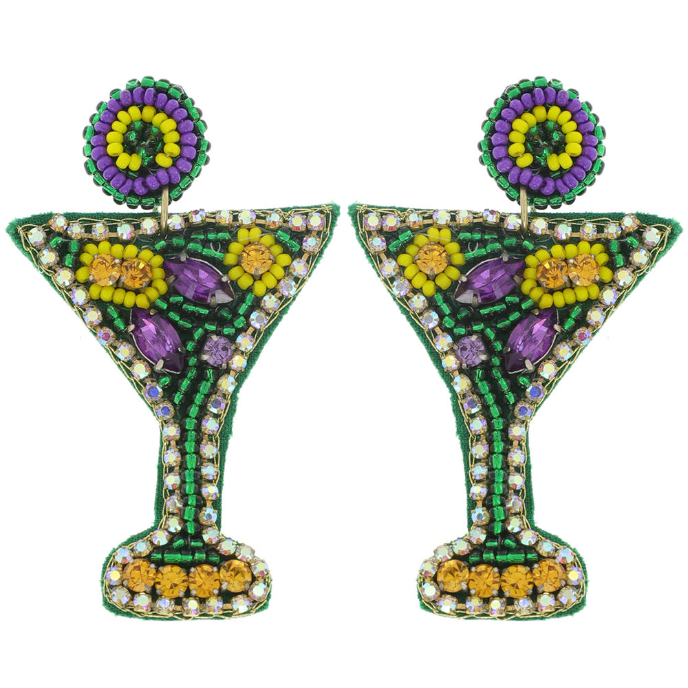 Mardi Gras Martini Cocktail Glass Beaded Earrings