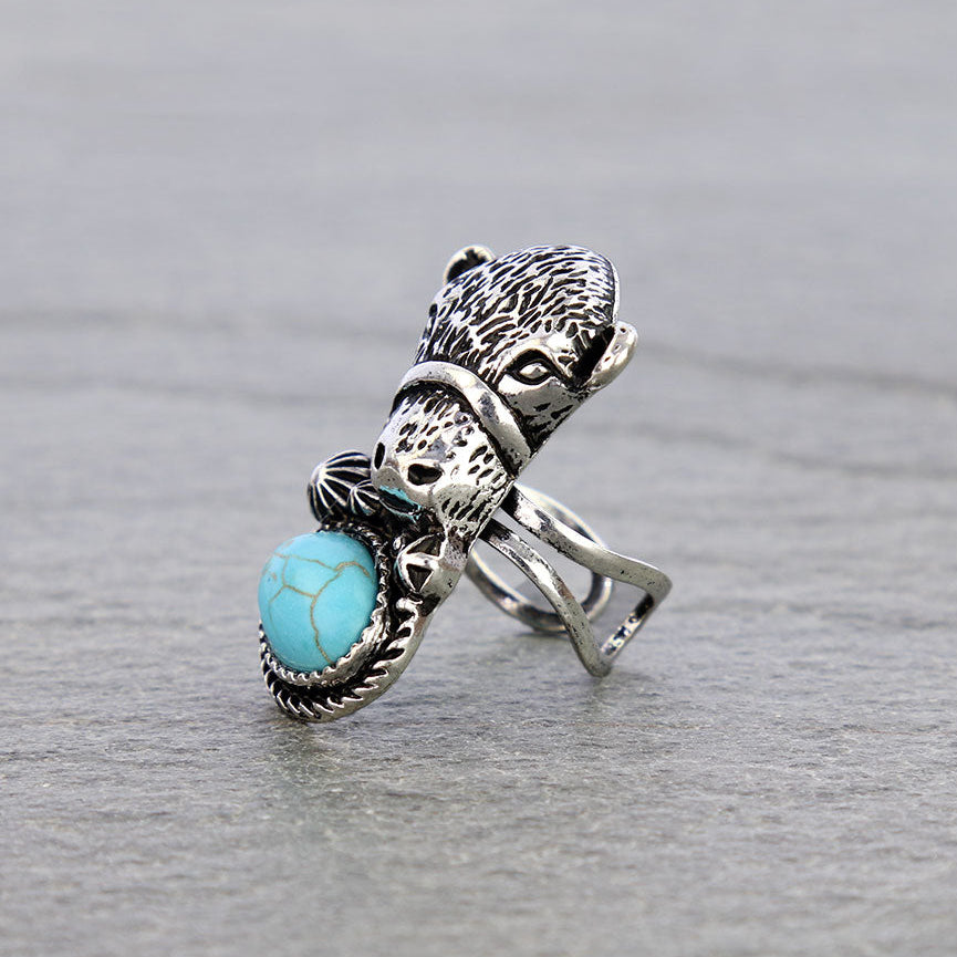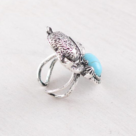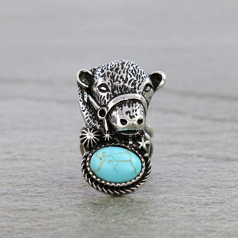 Embrace your wild western side with the Moo-d for Turquoise Silver Cow Ring. Featuring a striking silver cow head design accented with turquoise stones, this adjustable cuff ring delivers equal parts sass and sophistication. Hypoallergenic and silver plated, it’s a statement piece that captures the spirit of the open range and modern cowgirl glam.