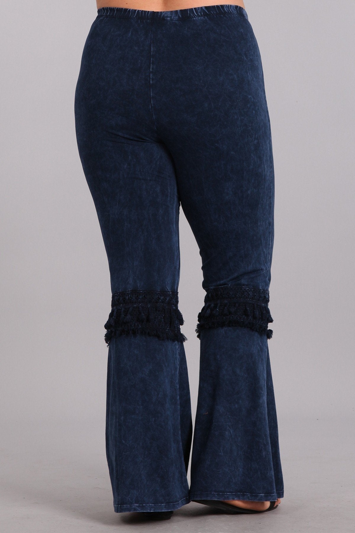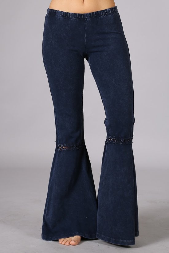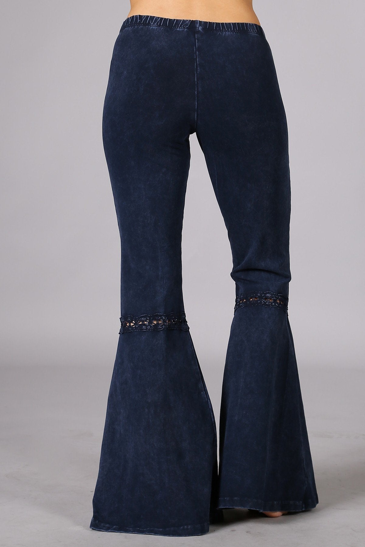 Mineral washed bell bottom pants with fringed crochet lace and elastic waist.