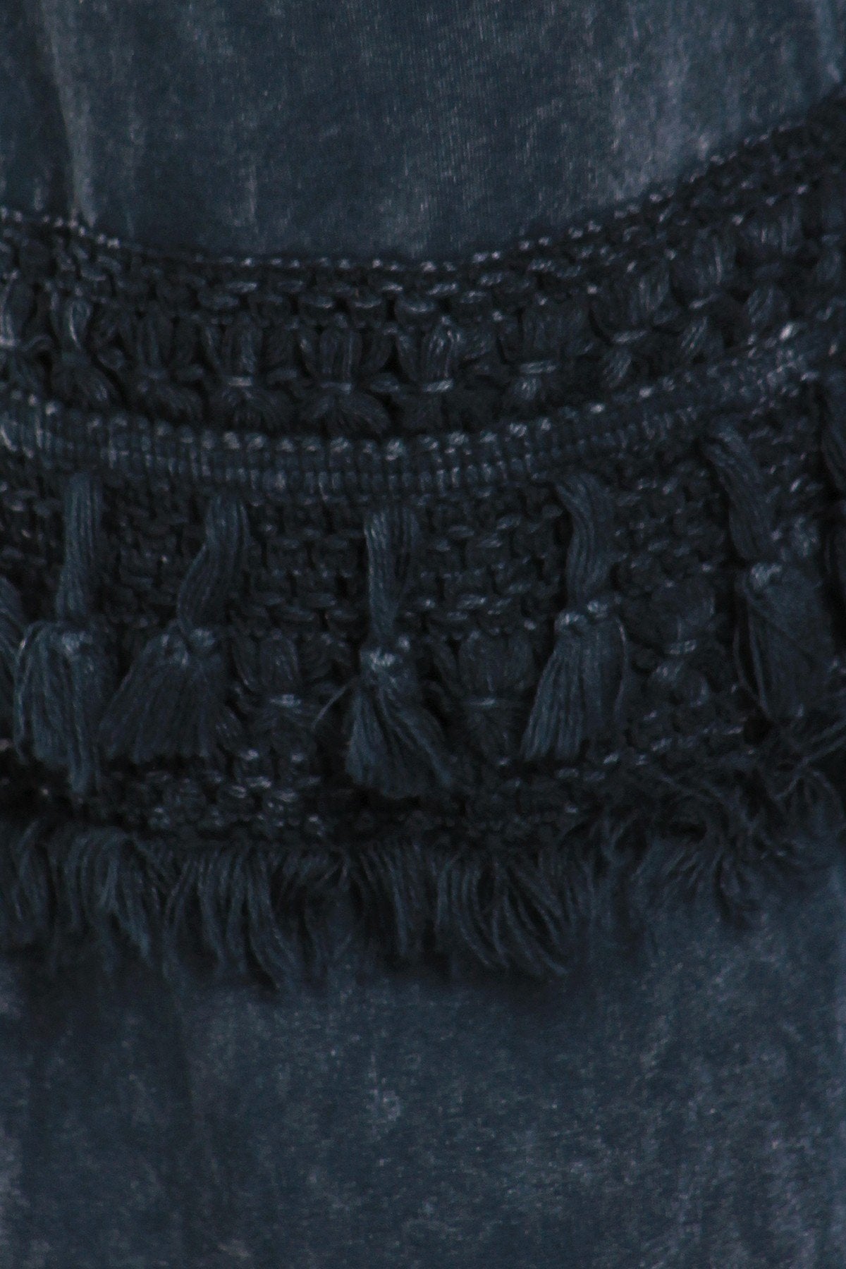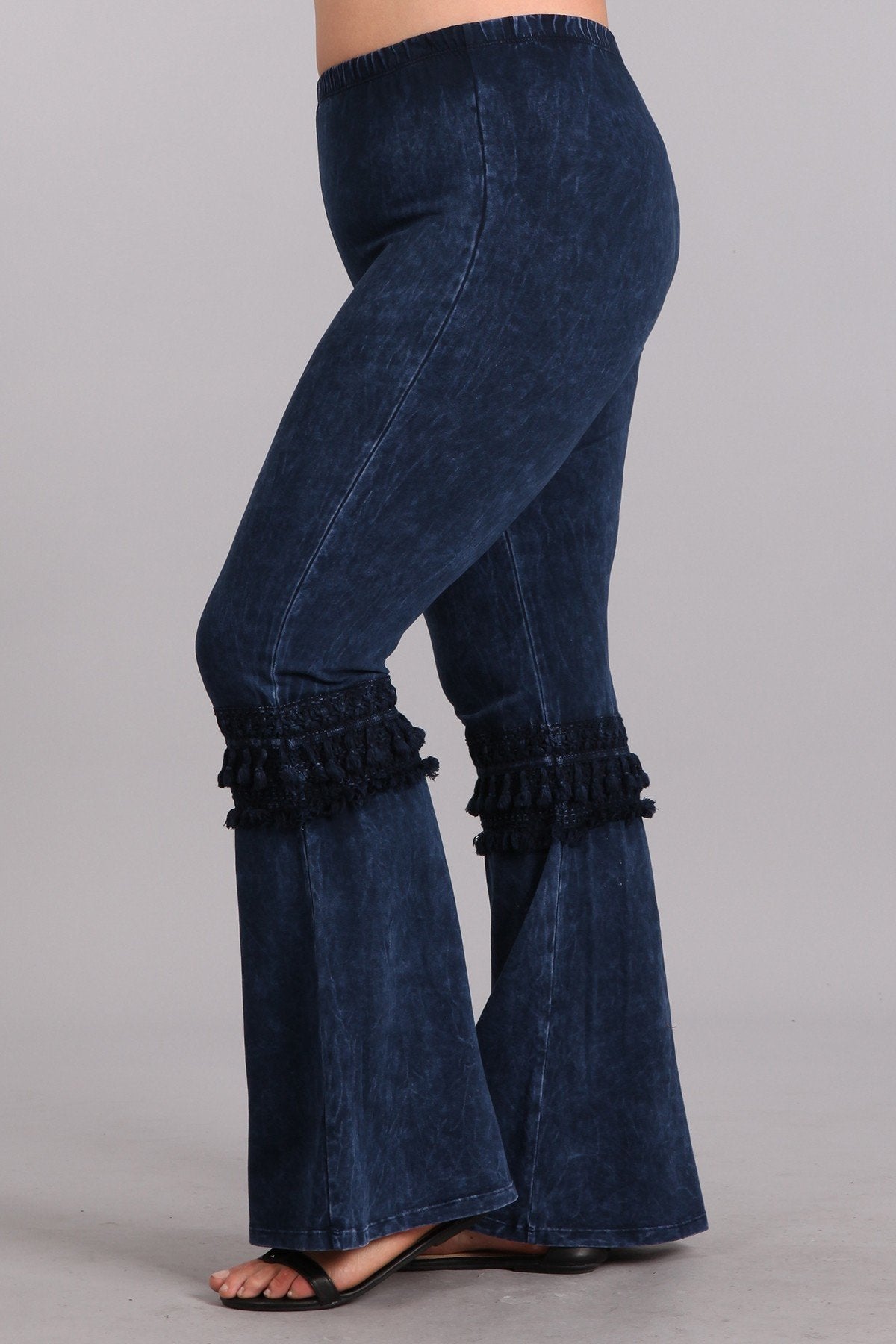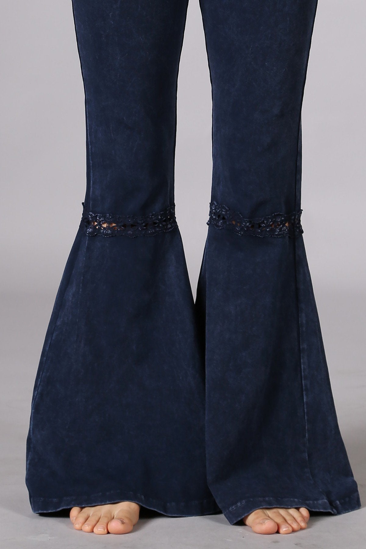 Mineral washed bell bottom pants with fringed crochet lace and elastic waist.