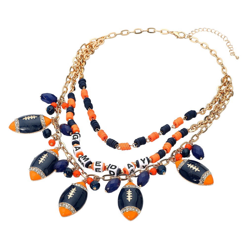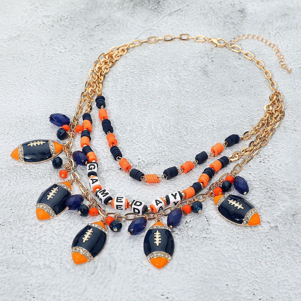 This layered gameday necklace blends blue and orange Heishi beads with football charms and “GAMEDAY” letter beads to energize any fan look. The playful, layered silhouette pairs perfectly with tees, jerseys, and tailgate-ready outfits.
