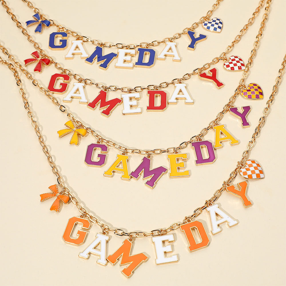 Celebrate your team spirit with this bold GAMEDAY word necklace in white and orange, featuring playful accent charms. A spirited accessory to complete your outfit for sporting events, tailgates, and fan gatherings.