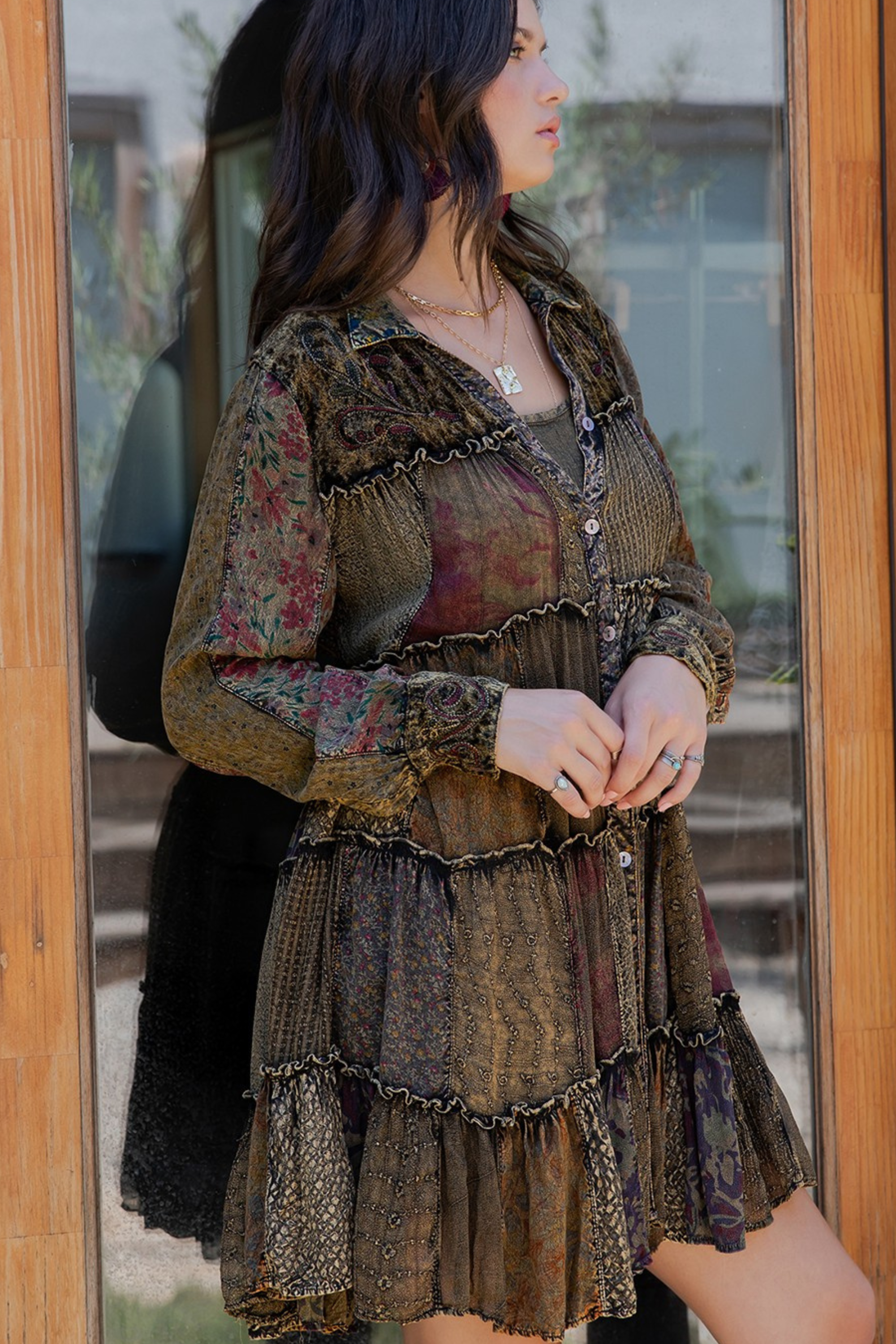 The Patchwork Poetry Babydoll Dress captures the essence of free-spirited boho charm with a cozy, fall-to-winter feel. Crafted from soft, breathable rayon, this dress features intricate multi-embroidered details and patchwork elements that make each piece one-of-a-kind. Designed with long sleeves, a collar, and a button-down front, it blends classic touches with relaxed boho style. The smooth, flowy rayon fabric offers comfort and a flattering above-the-knee to mid-thigh length, making it a go-to choice for seasonal layering or a stand-alone statement piece.