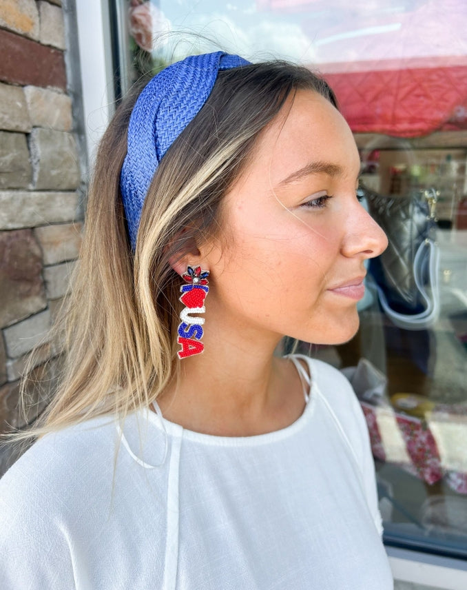 Patriotic I LOVE USA Red White Blue Beaded Earrings