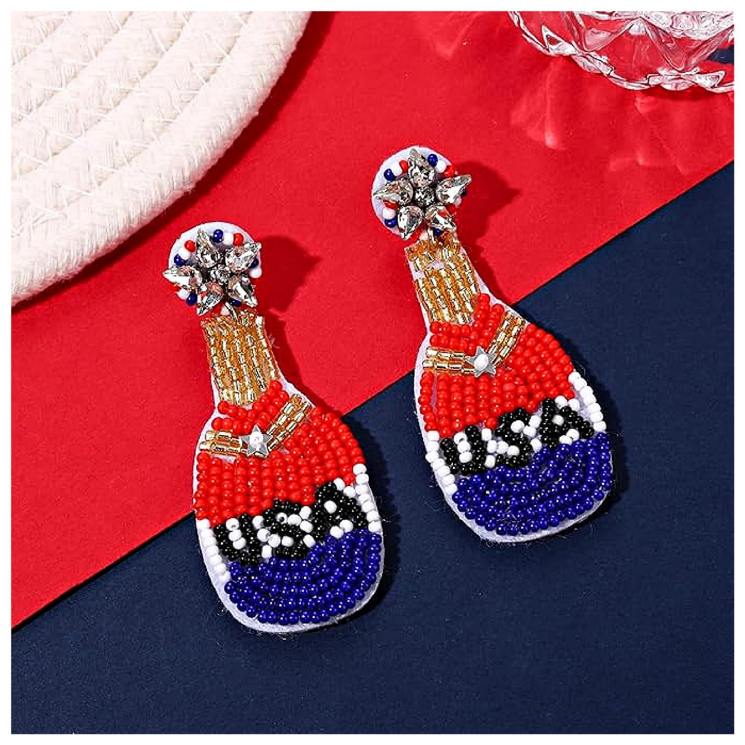 Patriotic USA Champagne Wine Bottle Seed Bead Earrings
