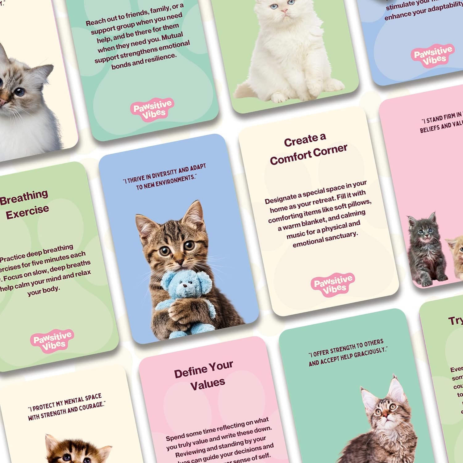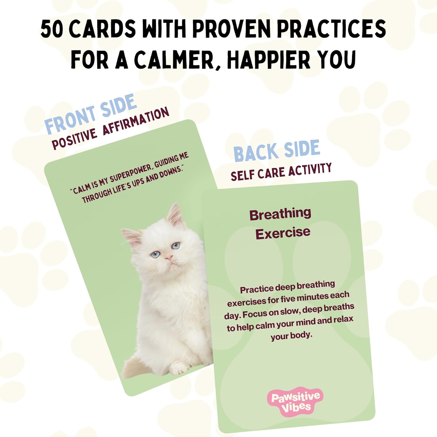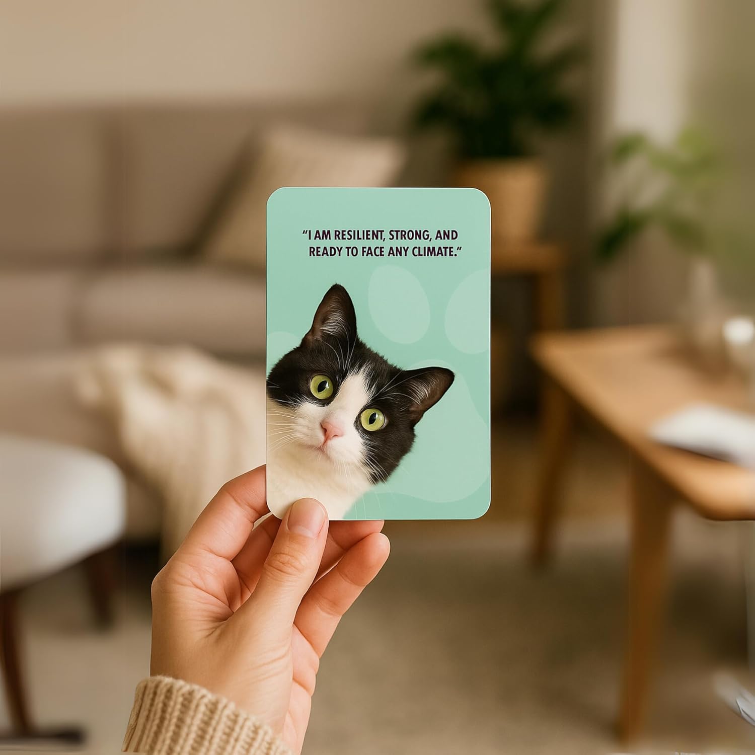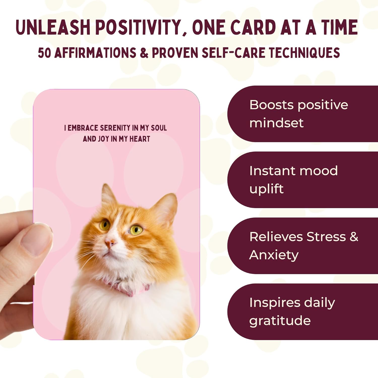 50 cat-themed affirmation cards with heartfelt messages, motivational quotes, proven self- care techniques, and enchanting cat-themed imagery, thoughtfully designed to bring joy, comfort, and emotional wellness into your daily routine.
